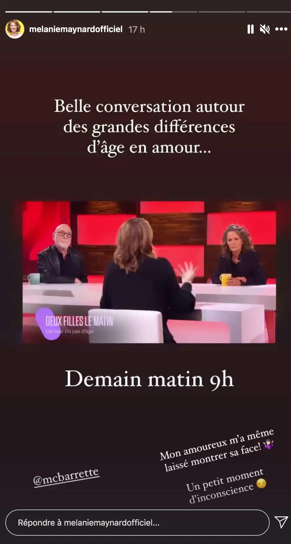 Sur le plateau de Deux filles le matin, la comédienne et animatrice s'est confiée un peu plus de sa relation. Le thème de l'émission était celui des couples qui ont une grande différence d'âge. Rappelons que Mélanie Maynard est de 13 ans l'aînée de son amoureux.
