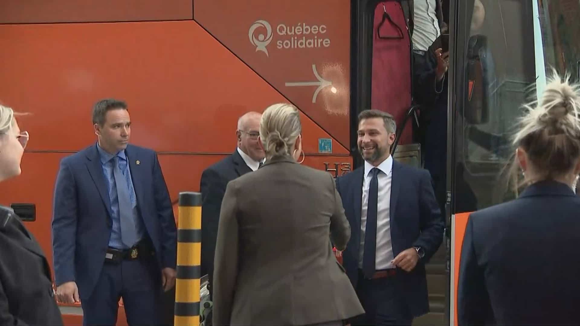 Gabriel Nadeau-Dubois, porte-parole de Québec solidaire (QS), fait son arrivée à TVA. Il va aussi rencontrer les partisans rassemblés à l'extérieur.