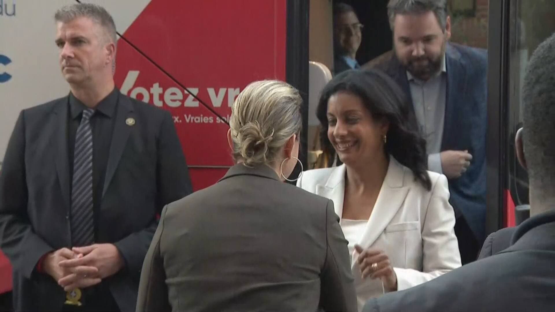 C’est au tour de la cheffe du Parti libéral du Québec (PLQ), Dominique Anglade, d’aller à la rencontre des militants à son arrivée.