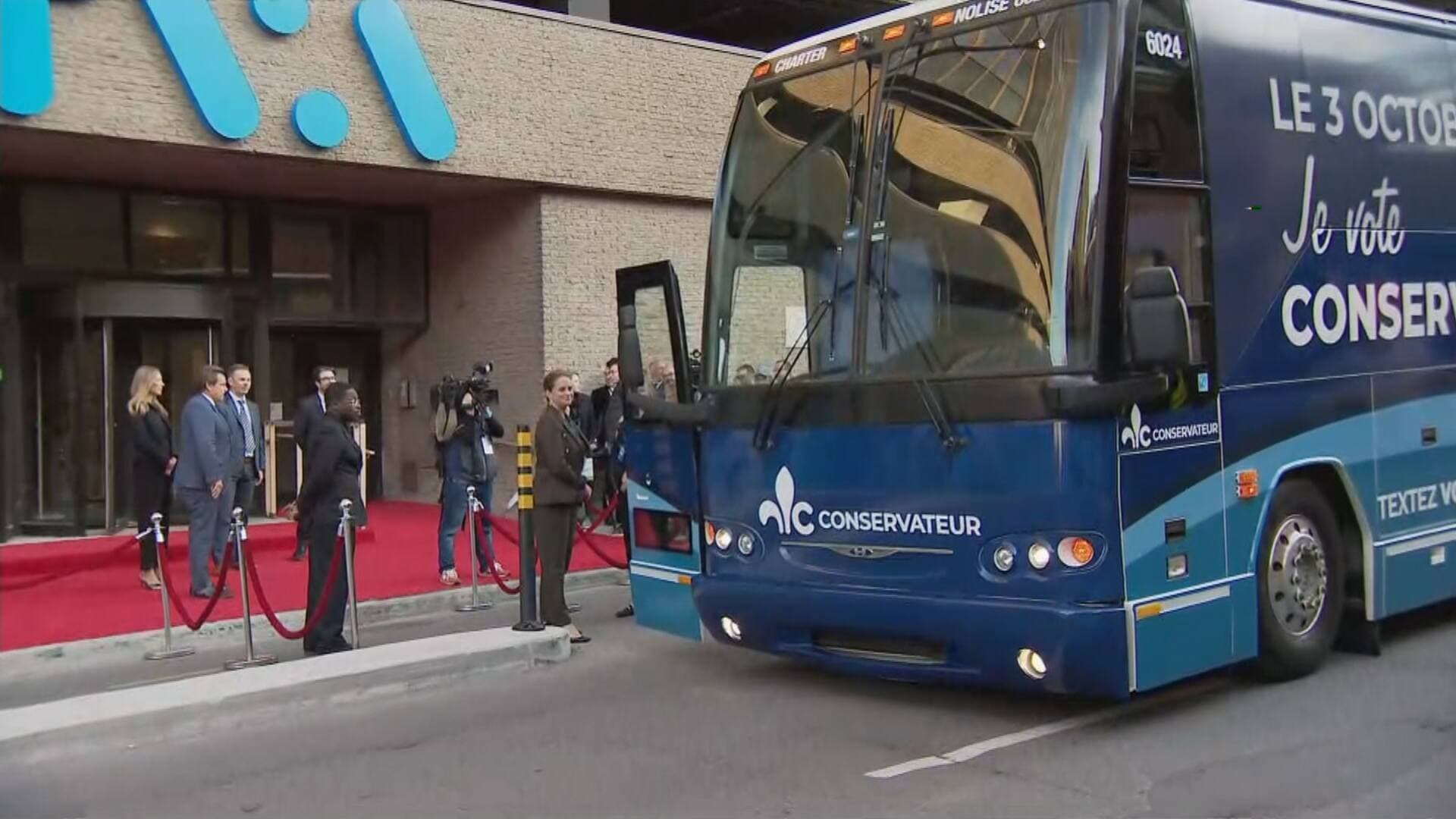 Le chef du Parti Québécois (PQ), Paul St-Pierre Plamondon, va à la rencontre de ses partisans dès sa sortie de l'autobus devant l'édifice de TVA.