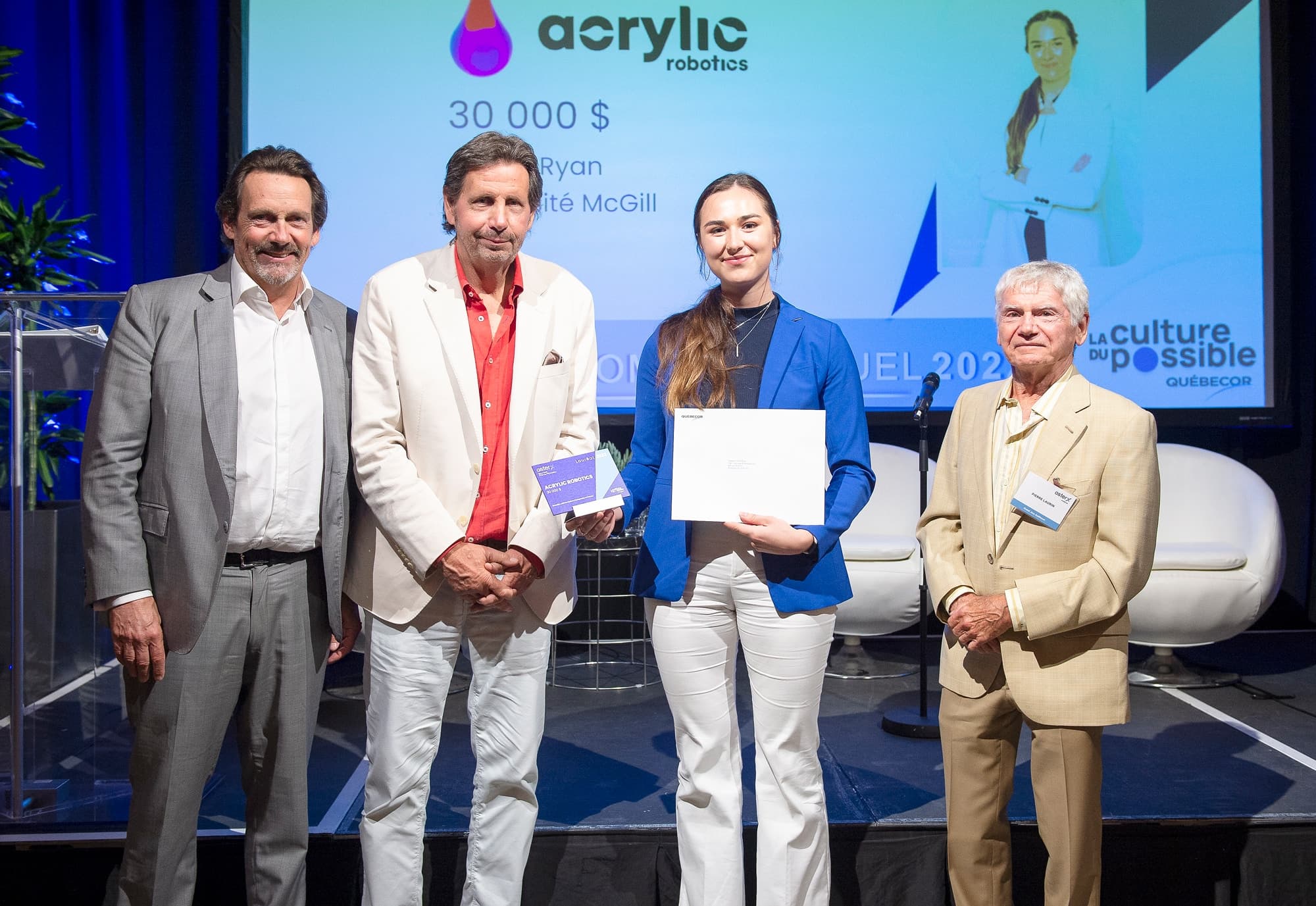 Pierre Karl Péladeau, Érik Péladeau et Pierre Laurin accompagnent Chloë Ryan, de l’Université McGill, dont l’entreprise, Acrylique Robotiques, a pour mission de démocratiser l’accès aux œuvres artistiques à l’aide de la technologie robotique.