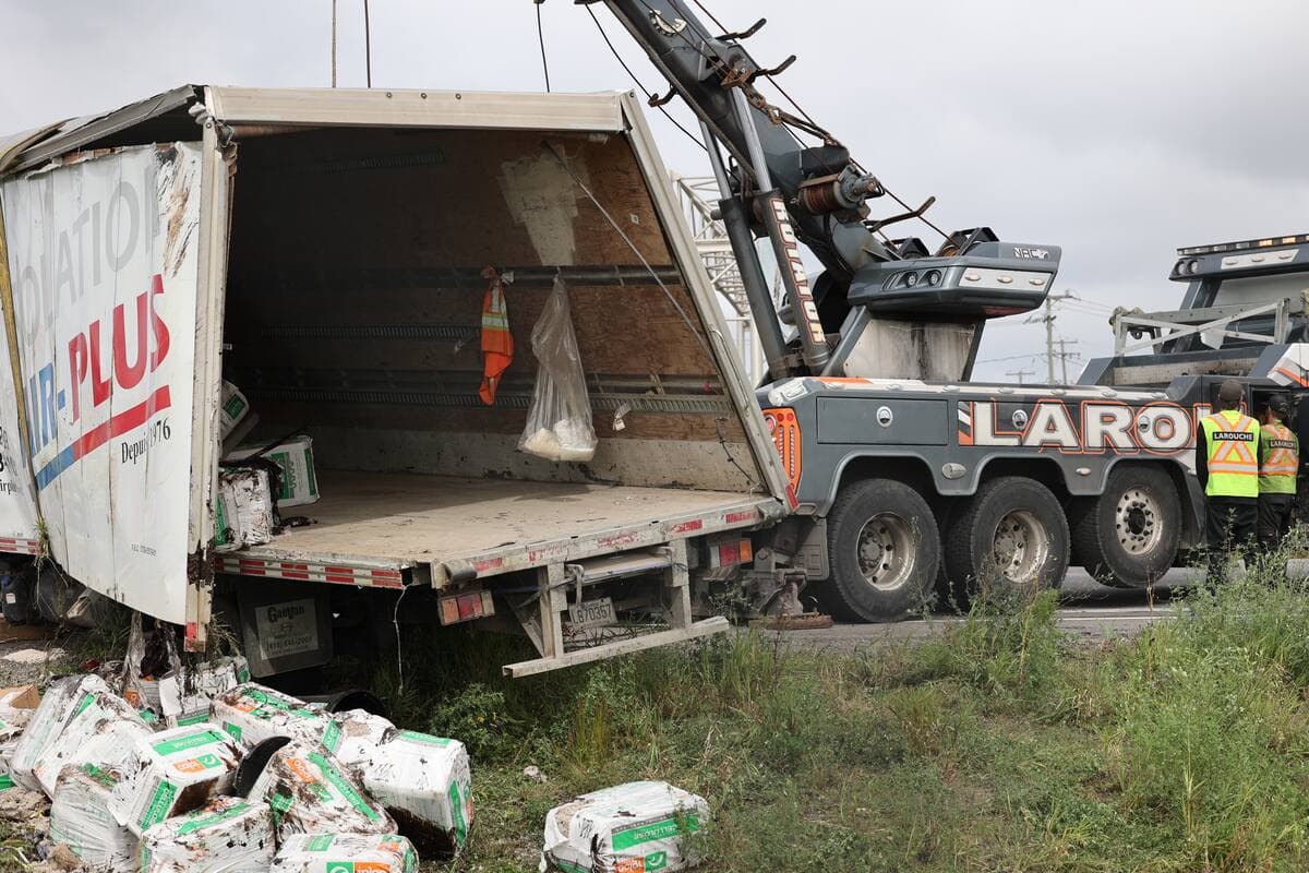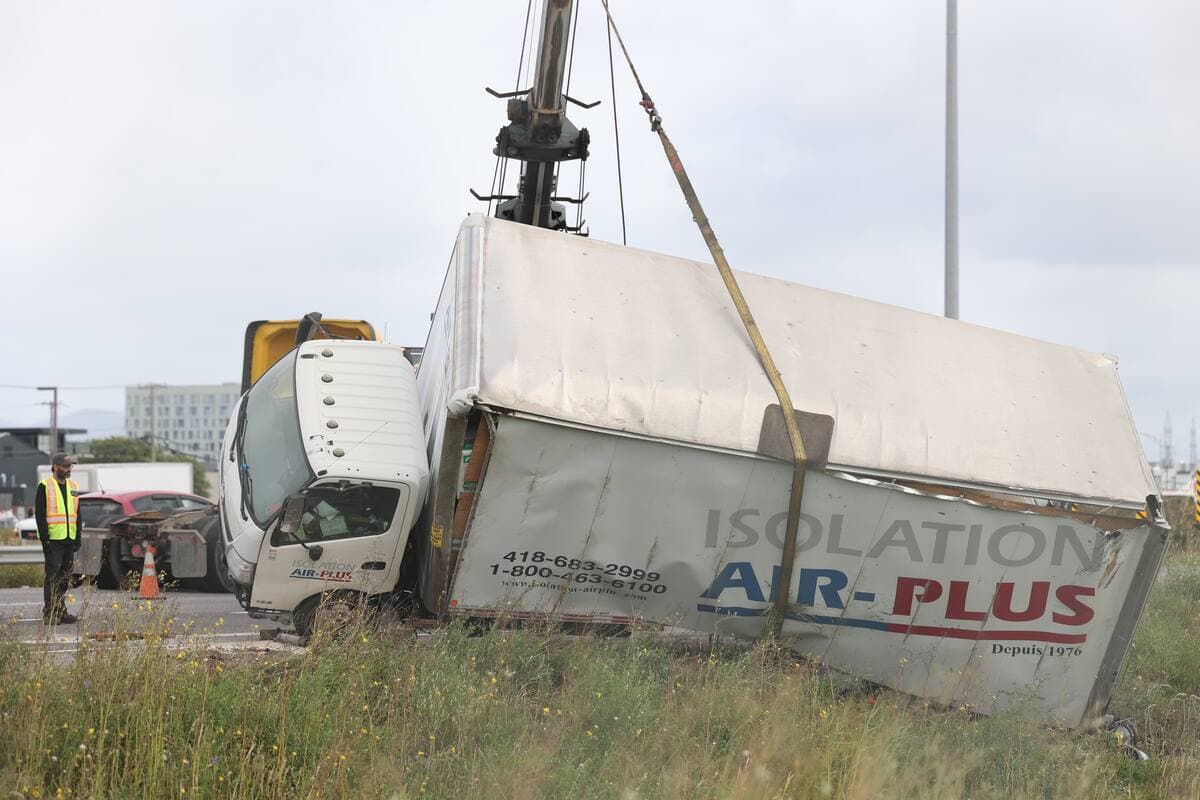 Un camion cube s’est renversé sur l’autoroute de La Capitale, jeudi matin, répandant l’entièreté de sa cargaison sur la route après être entré en collision avec un autobus de ville en transit.