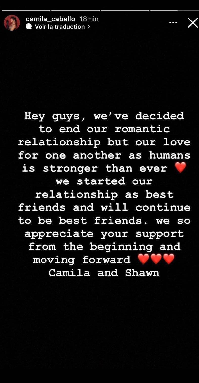 17 novembre 2021 : Shawn et Camila annonçent leur rupture sur Instagram.