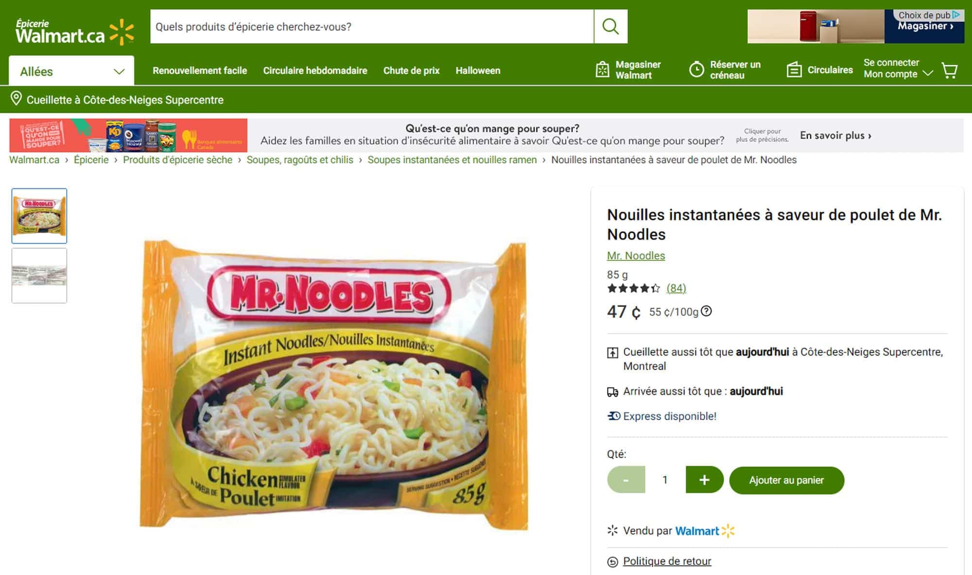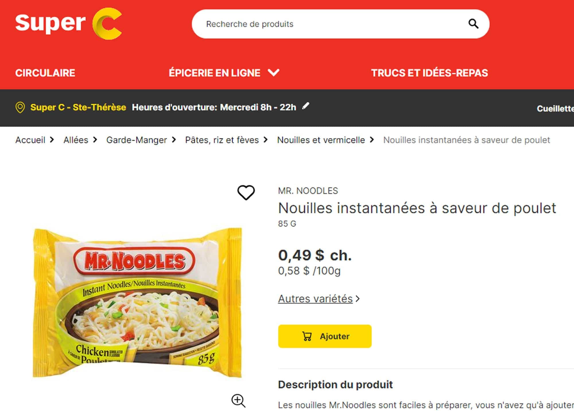 Prix au Québec pour un paquet de Mr. Noodles