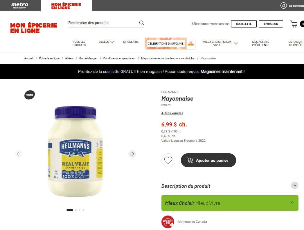 Prix au Québec pour 890 ml de Hellmans