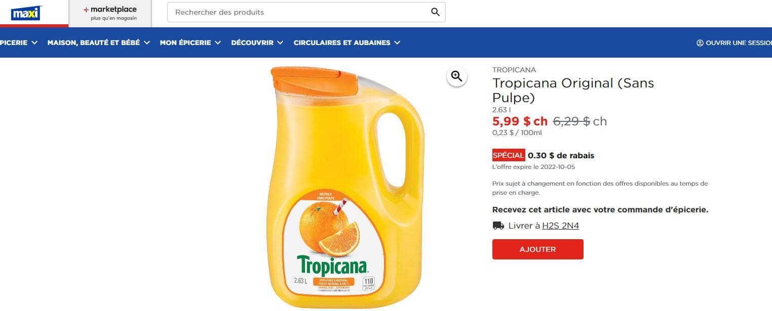Prix au Québec pour Tropicana sans pulpe de 2,63 litres