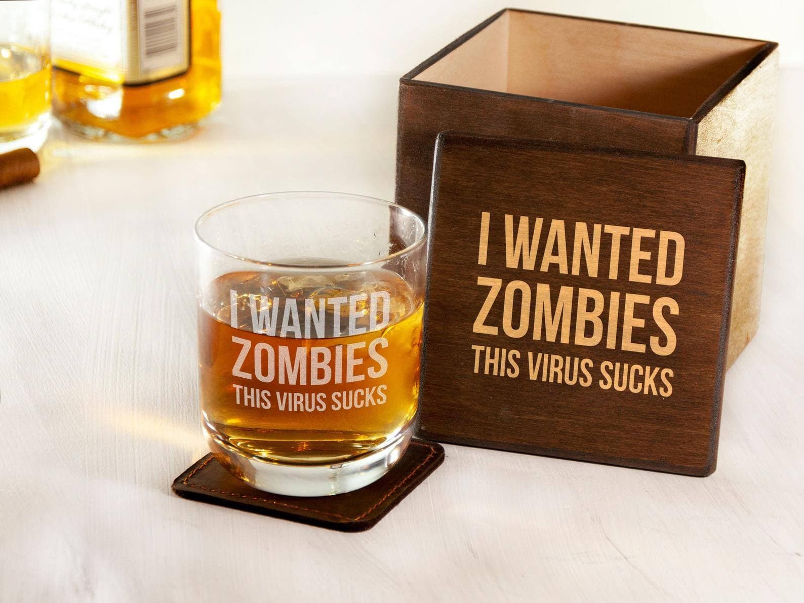9. Un beau verre de whisky qui suggère qu’on aurait plus aimé des zombies qu’un virus (24,13$)