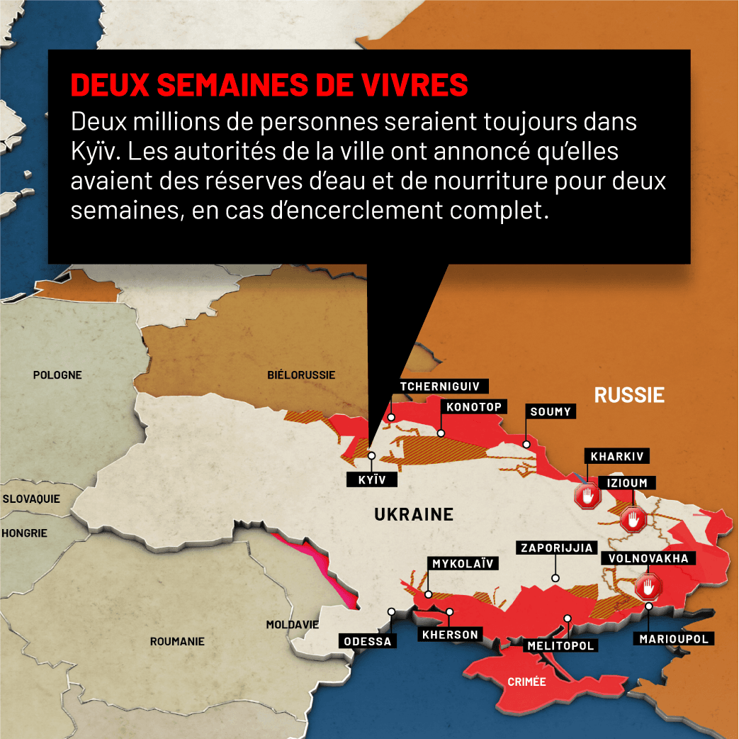 Kyïv demeure la cible principale de l’armée russe, tandis que les villes de Khartiv, Khusan, Luhansk et Marioupol continuent à être bombardées. Plusieurs villes situées au nord de Marioupol auraient été prises.