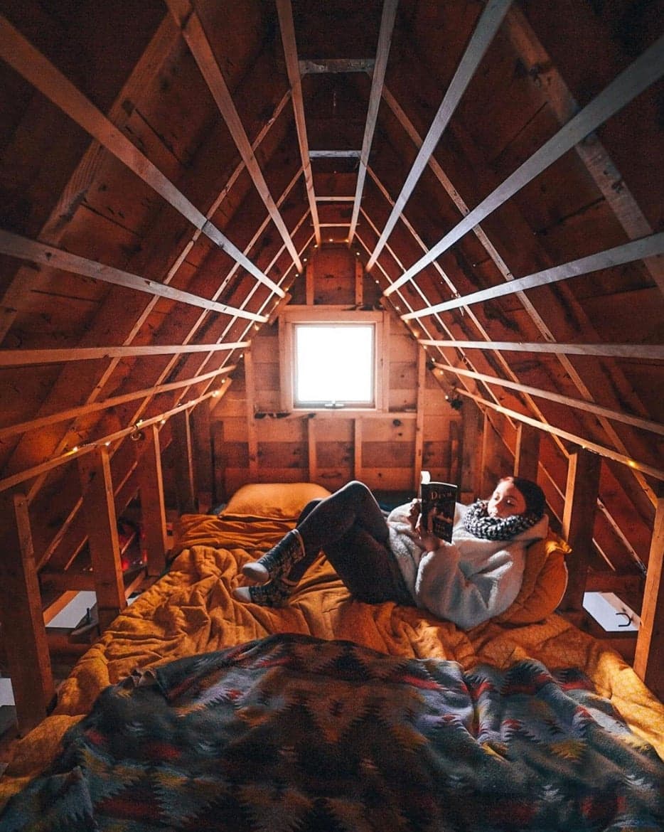 Ce mini chalet composé d'une aire ouverte et d'une chambre possède même un accès au lac!