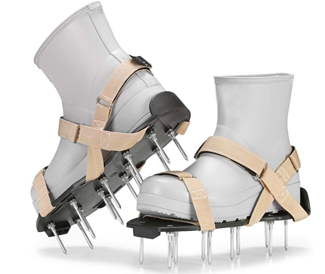 Logiquement, il faut aider le sol à s’aérer afin que l’oxygène, les nutriments et l’eau pénètrent bien. Il existe des sangles pour souliers peu dispendieuses pour réaliser cette étape de la façon la plus simple possible: en marchant!