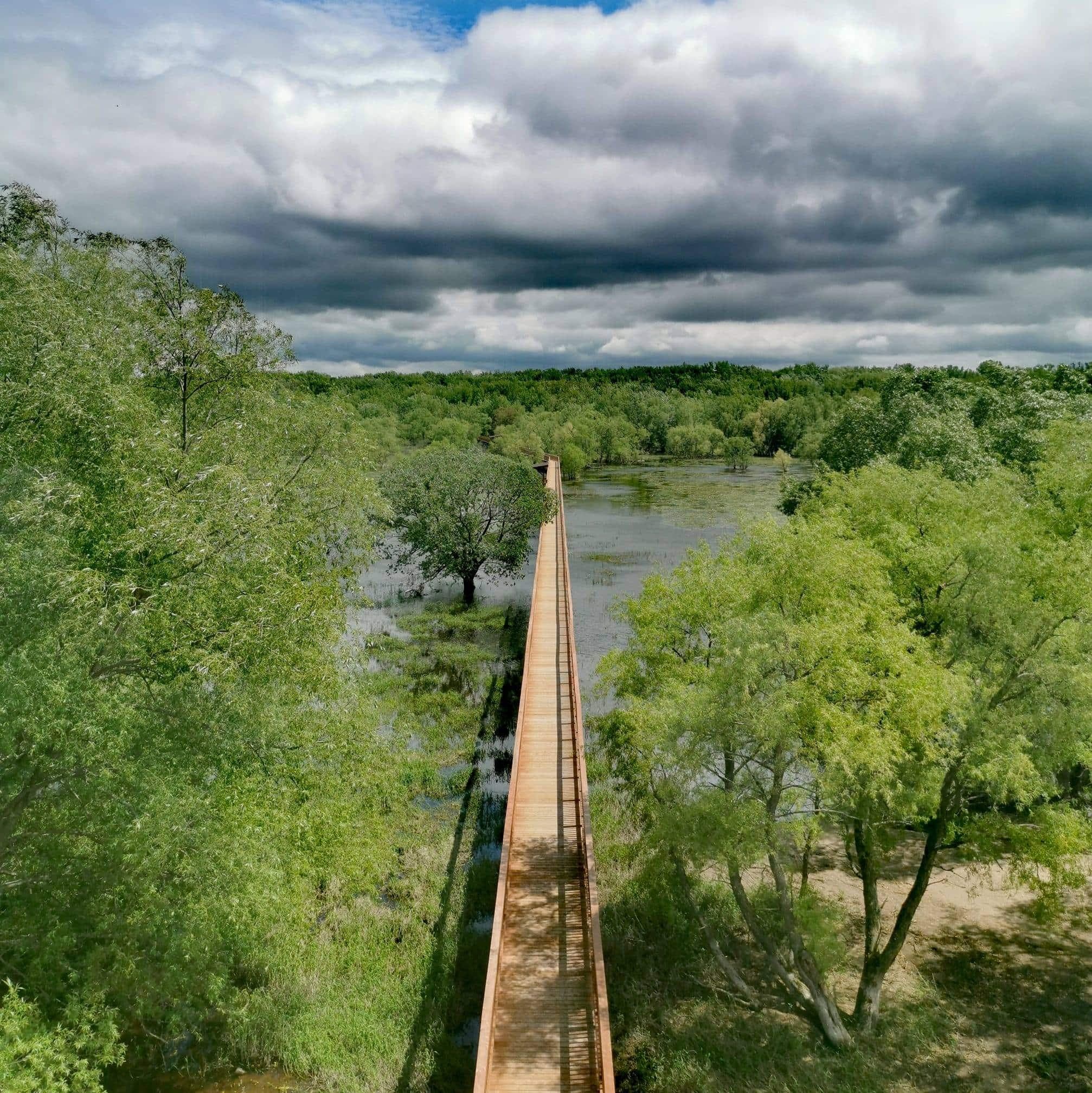 L'immense passerelle en bois de 710 mètres fait parler d'elle. Située en bordure du fleuve Saint-Laurent, elle se déploie à travers le parc écomaritime de l'Anse-du-Port. Cette balade, en zone inondable, propose une véritable immersion, en symbiose avec la nature.