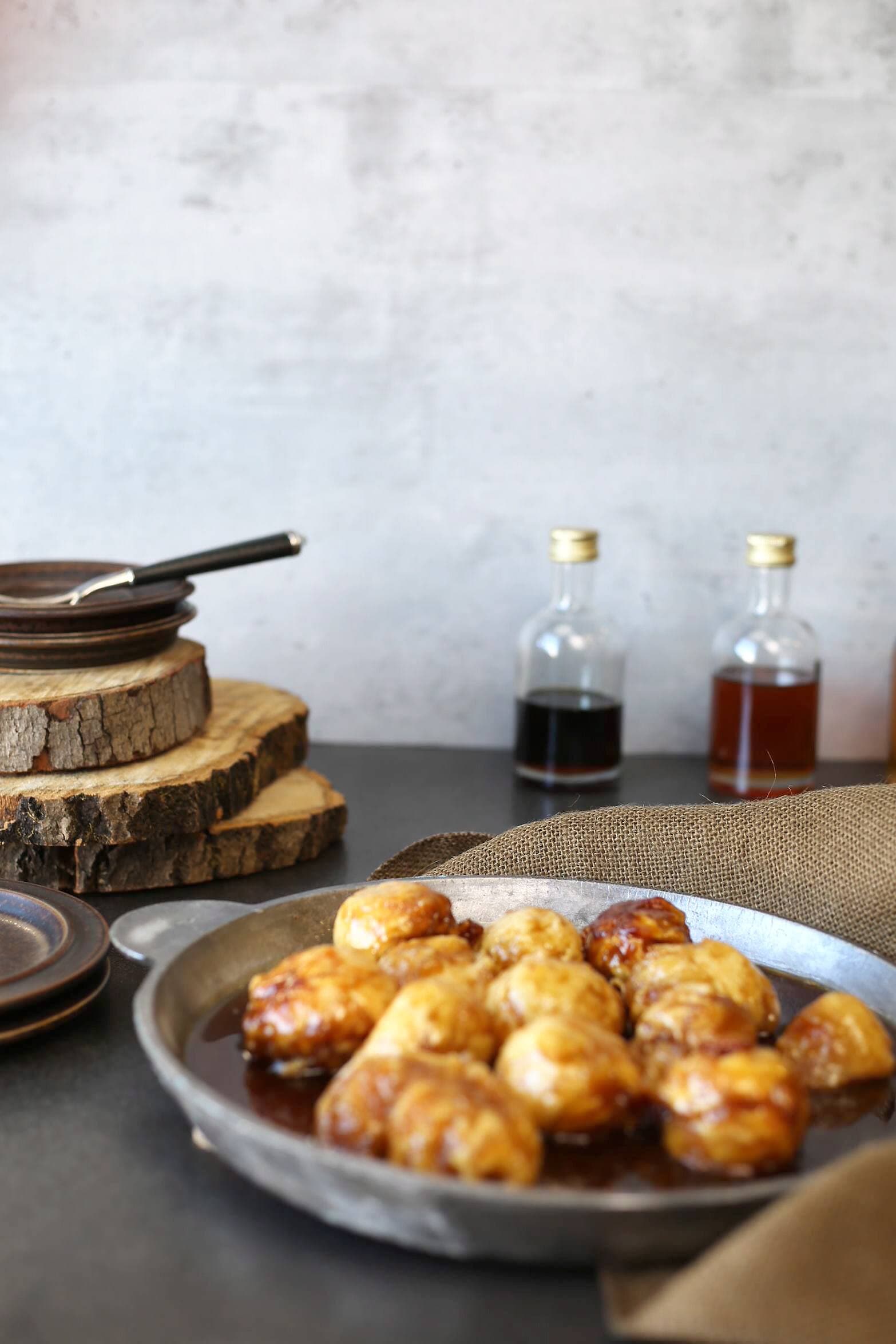 - À l’aide d’une cuillère à crème glacée, former des boules de pâte et les cuire dans le sirop (qui mijote) pour 10 à 15 minutes. Répéter l’opération avec le reste de la pâte.