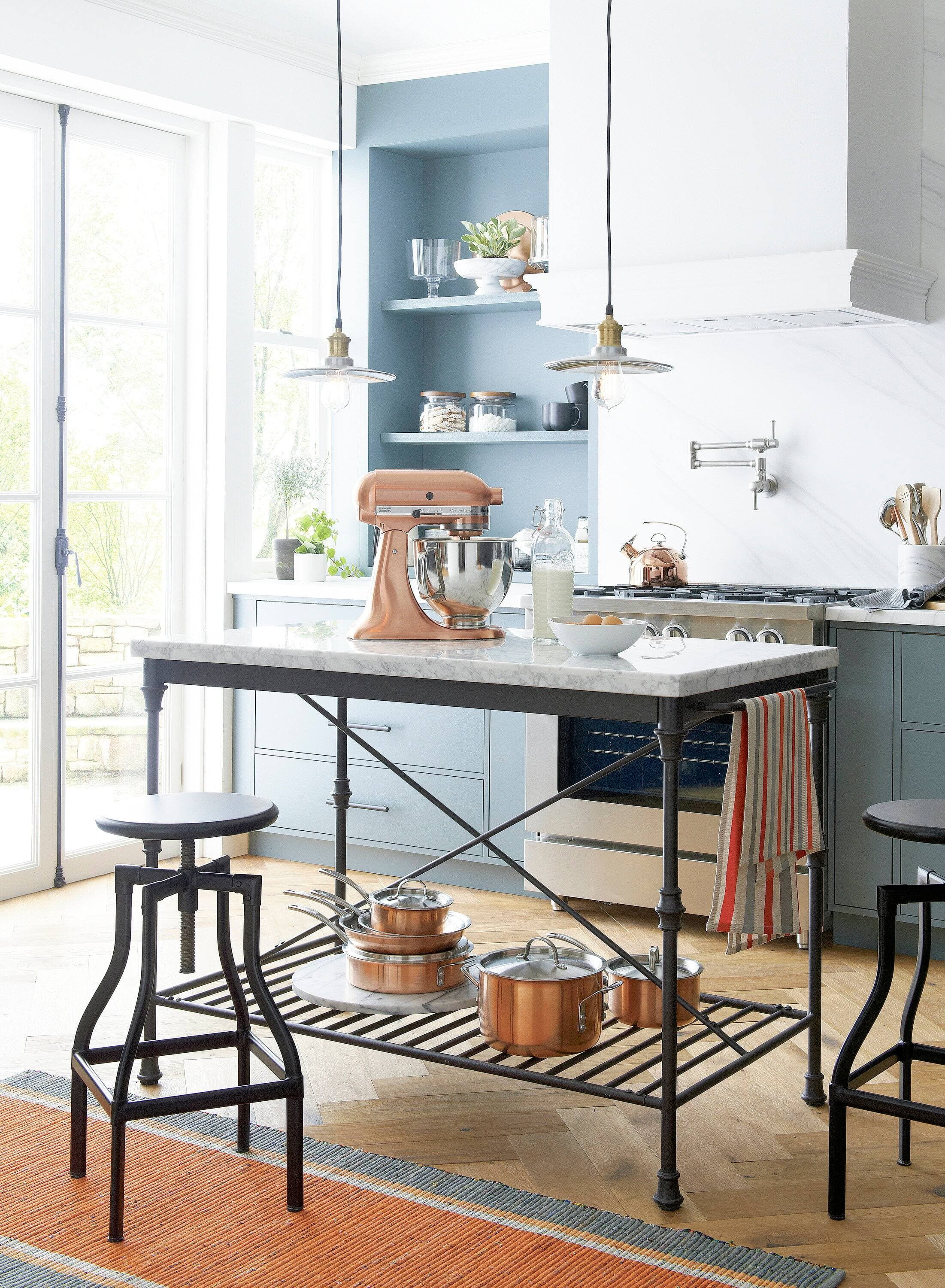 Cette cuisine lumineuse est une ode à la convivialité et à la créativité culinaire. L’ambiance, portée par un bel îlot central recouvert de marbre où s’adonner à la pâtisserie, se pare d’armoires bleu clair, d’un chic plancher à chevrons et d’une hotte cachée sous une cheminée imposante. Découvrez comment reproduire ce cadre inspirant, même avec un budget modeste, grâce à des astuces déco et des choix malins.