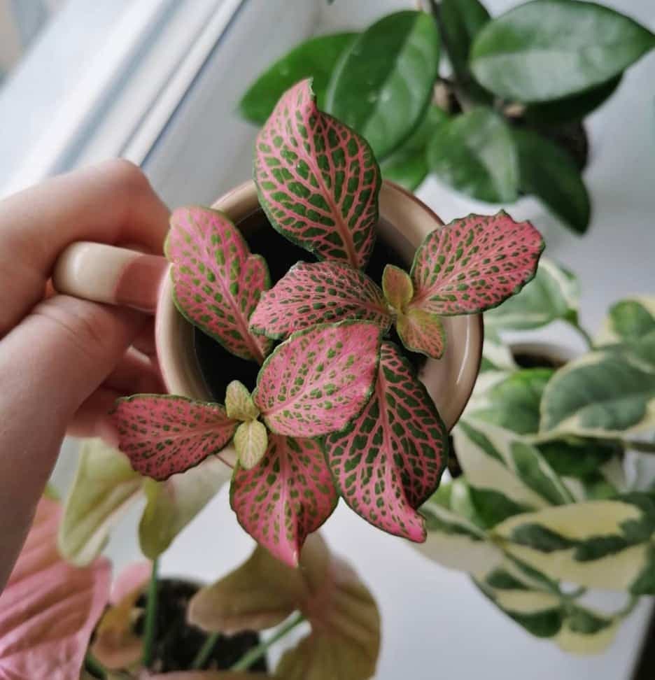 Le fittonia possède de délicates feuilles roses, qui aimeront l'humidité de la salle de bain.