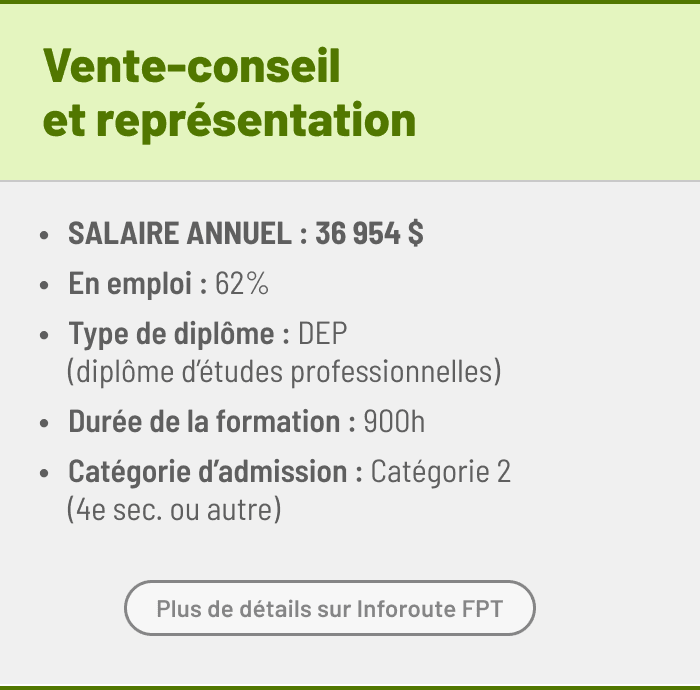 Or selon les données du ministère de l’Éducation, le programme de vente-conseil est loin d’être l’un des plus payants: un an après la fin de leurs études, les diplômés gagnent en moyenne 37 000$, alors que le chèque de paye peut être deux fois plus élevé pour d’autres diplômés.