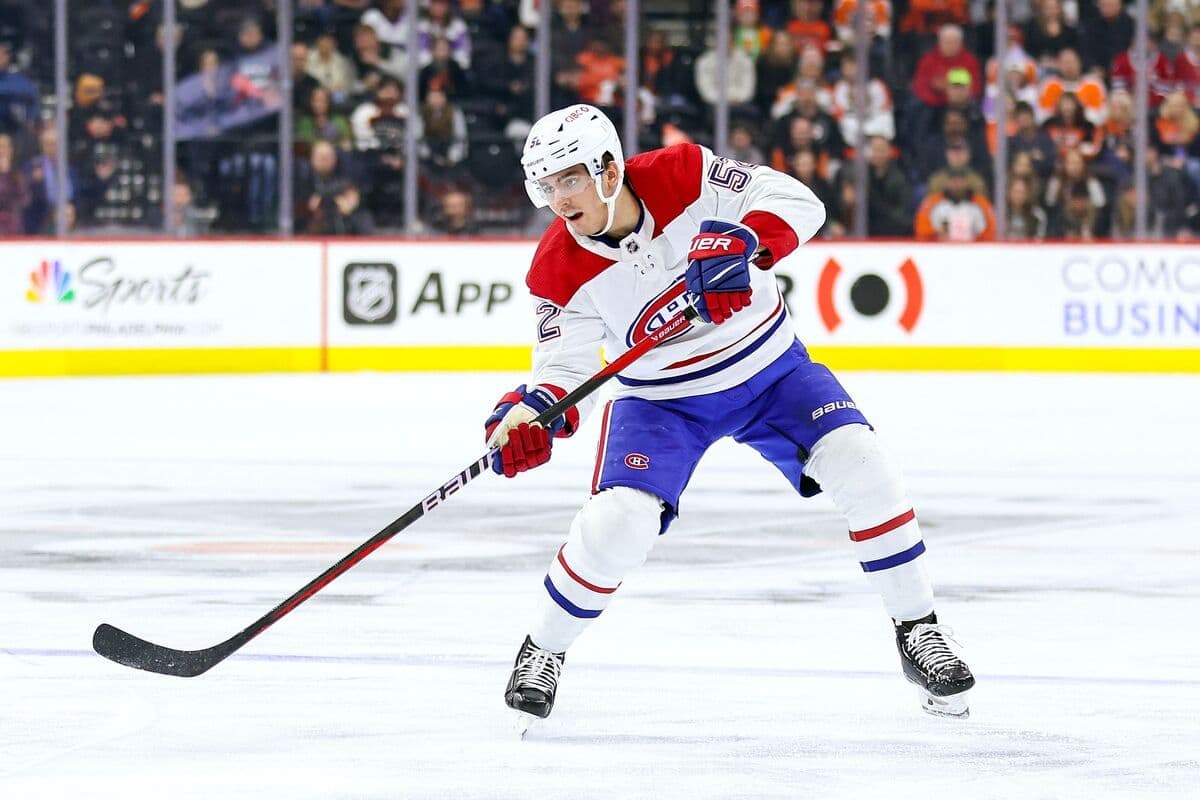 Le défenseur Justin Barron a patiné en solitaire quelques minutes avant l’entraînement du Canadien de Montréal, vendredi avant-midi, au complexe sportif de Brossard.