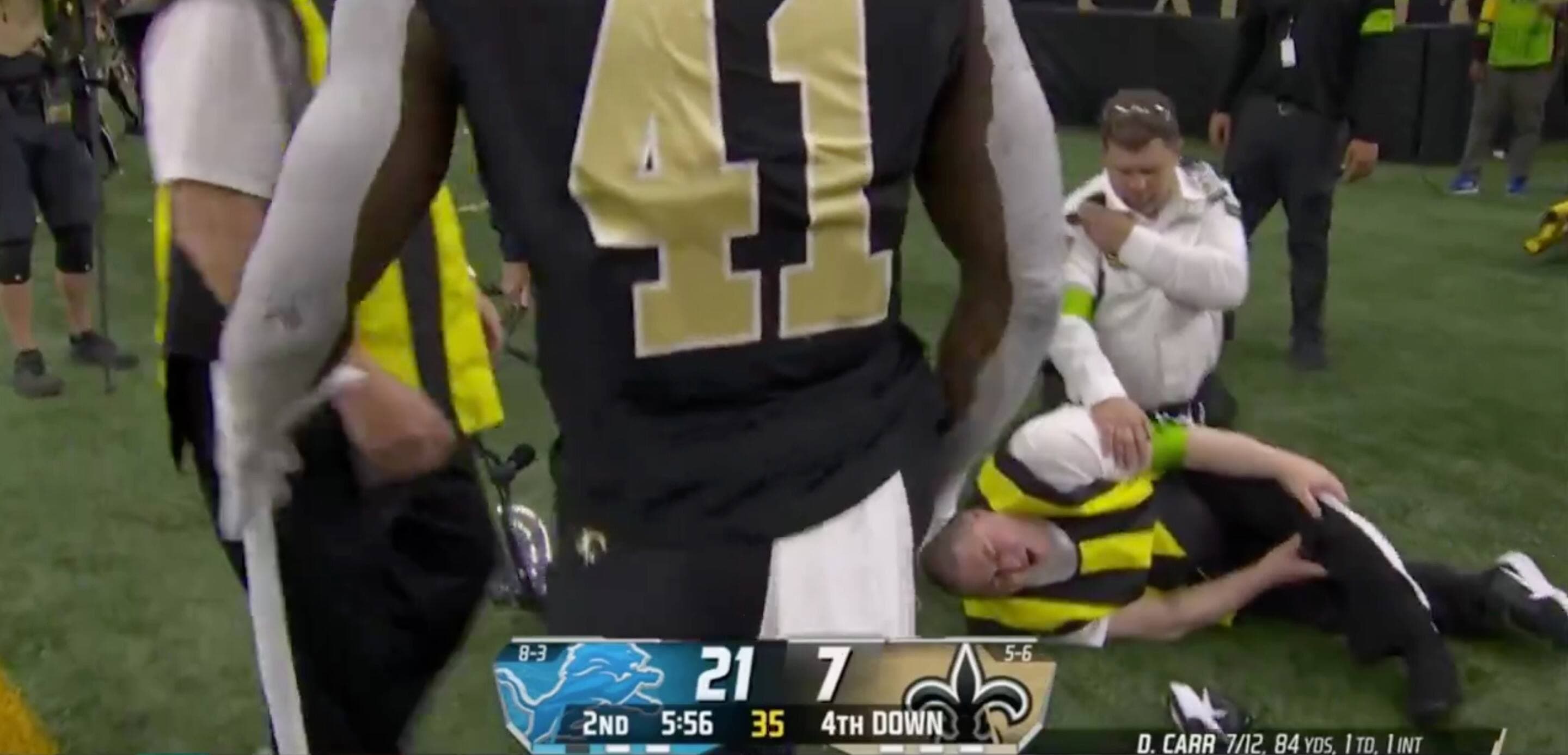 En effet, environ six minutes avant le retour aux vestiaires, le porteur de ballon Alvin Kamara a gravement blessé un officiel sur le bord du terrain. Le numéro 41 a perdu l’équilibre suite à un placage et a par la suite heurté l’individu qui se tordait de douleur après l’incident.