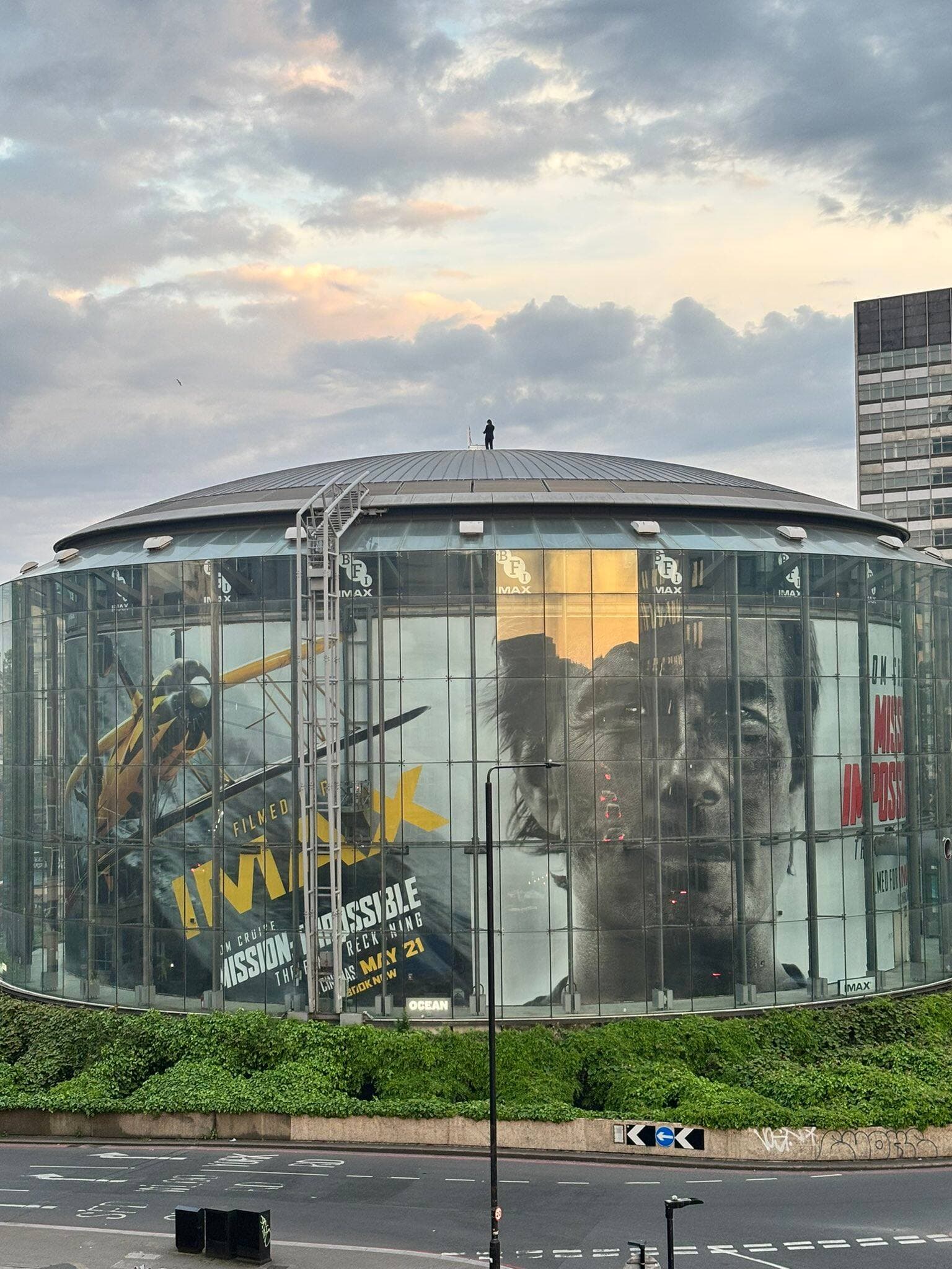 Tom Cruise standing on top of the BFI IMAX theater. pic.twitter.com/yuMThms8tD