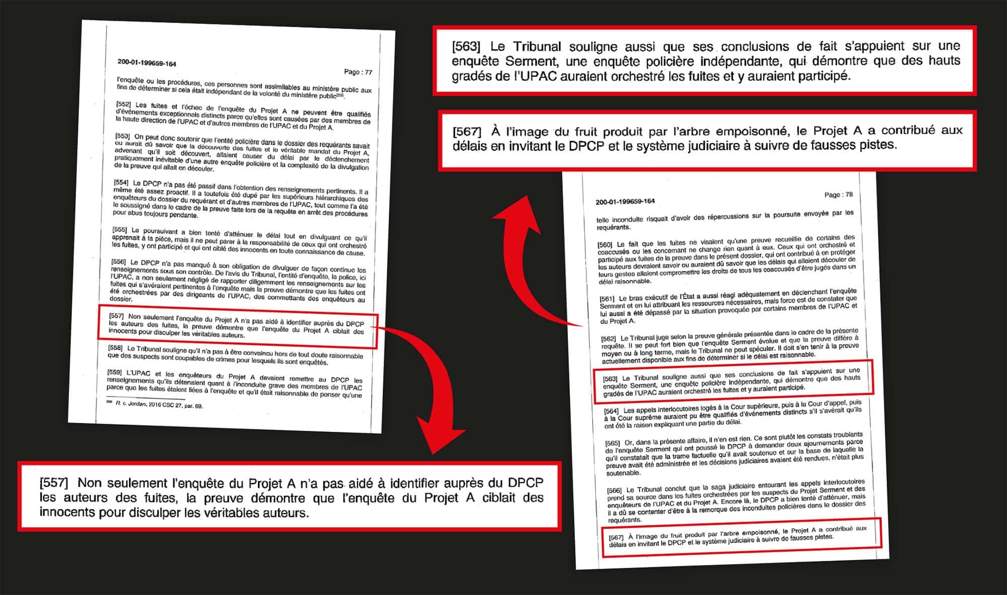 - «Robert Lafrenière a initié [sic] le Projet A en sachant que la direction était responsable des fuites à l’UPAC. André Boulanger, Caroline Grenier-Lafontaine et Vincent Rodrigue ont instrumentalisé cette enquête pour contrecarrer le cours de la justice.»