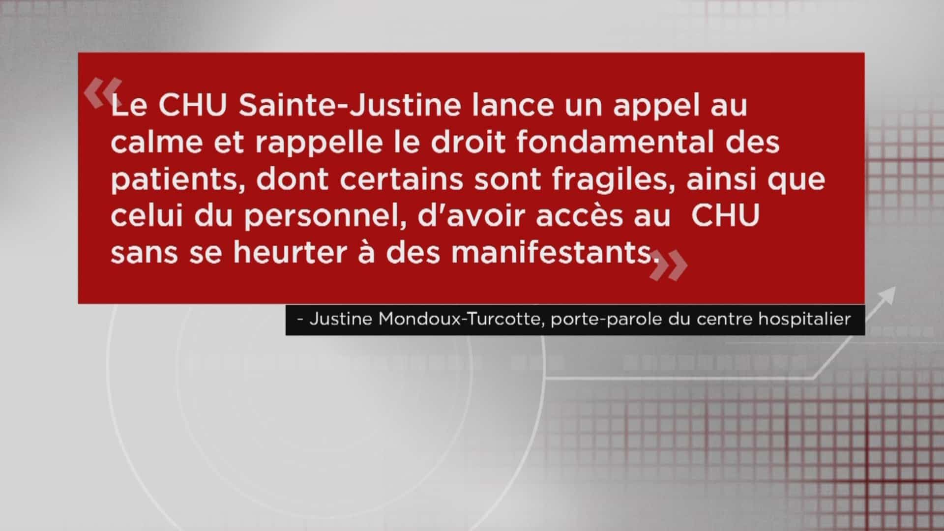 Du côté du CHU Sainte-Justine, l’établissement a lancé «un appel au calme et rappelle le droit fondamental des patients, dont certains sont fragiles, ainsi que celui du personnel, d’avoir accès au CHU sans se heurter à des manifestants».