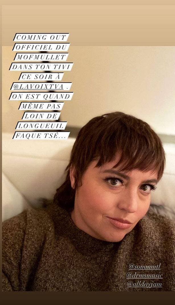 «Coming out officiel du mofmullet dans ton tivi ce soir à La Voix. On est quand même pas loin de Longueuil faque tsé...», avait-elle alors écrit en guise de légende.