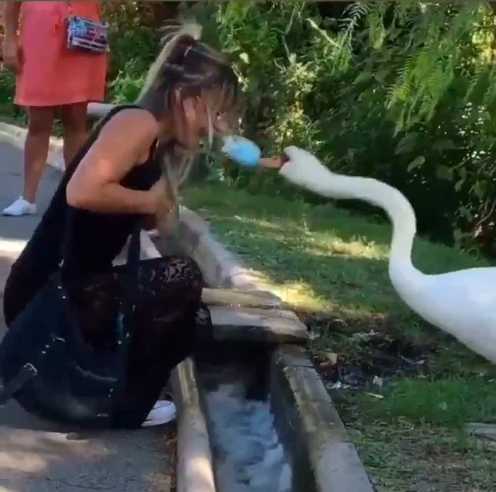 Dans une vidéo publiée jeudi sur Twitter, on peut voir une femme qui ne porte pas bien son masque s’accroupir pour s’approcher d’un cygne.