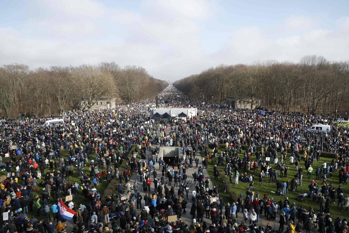 À Berlin la mobilisation a été cinq fois plus élevée que ce qu’attendaient les organisateurs, témoignant de l’émotion suscitée par la guerre en Ukraine, qui réveille de sombres souvenirs dans cette métropole qui fut l’épicentre de la Guerre froide jusqu’en 1990.