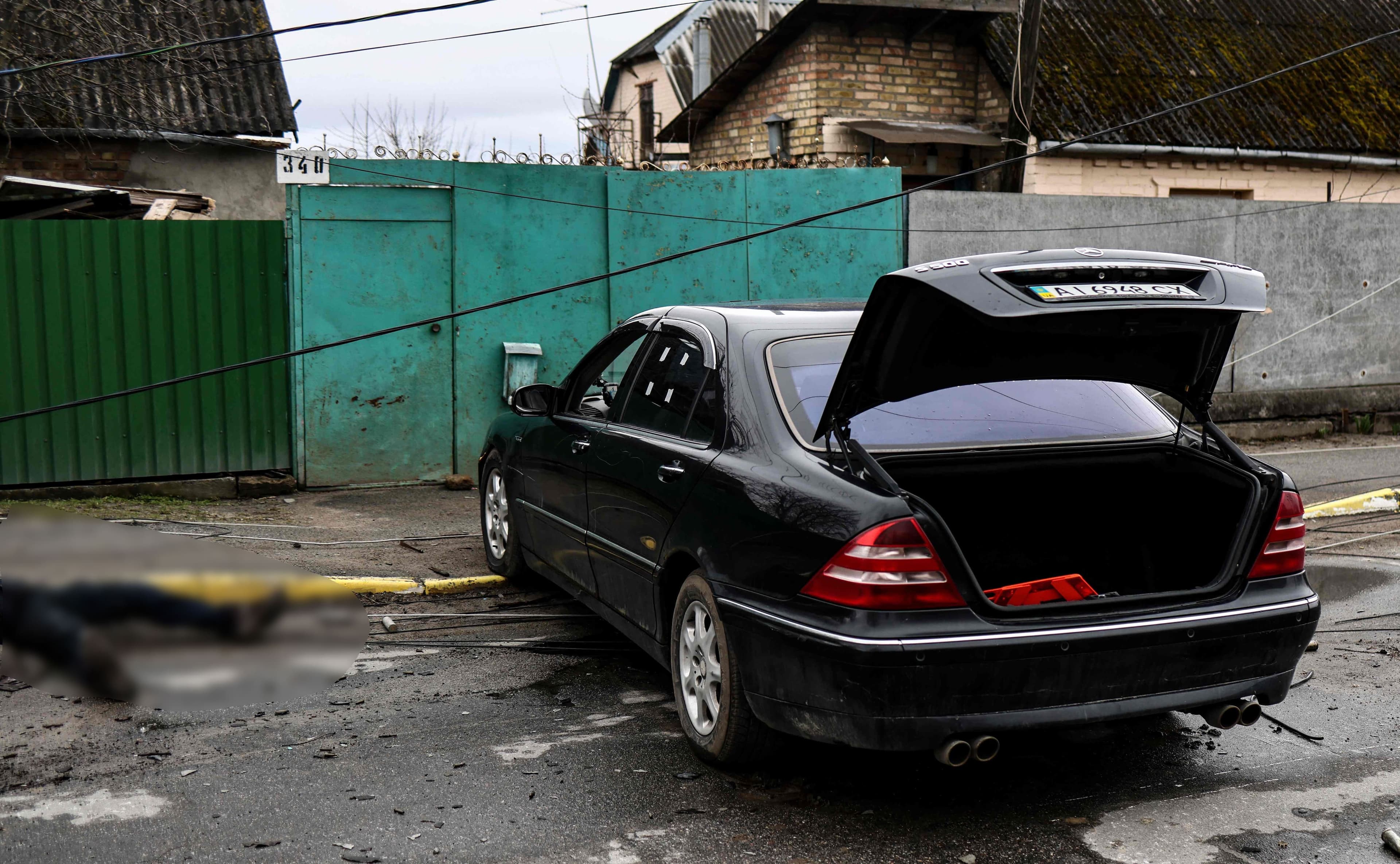 Seize de la vingtaine de cadavres découverts dans une rue de Boucha se trouvaient sur le trottoir ou sur le bord du trottoir. Trois étaient au milieu de la chaussée et un autre dans la cour d'une maison.