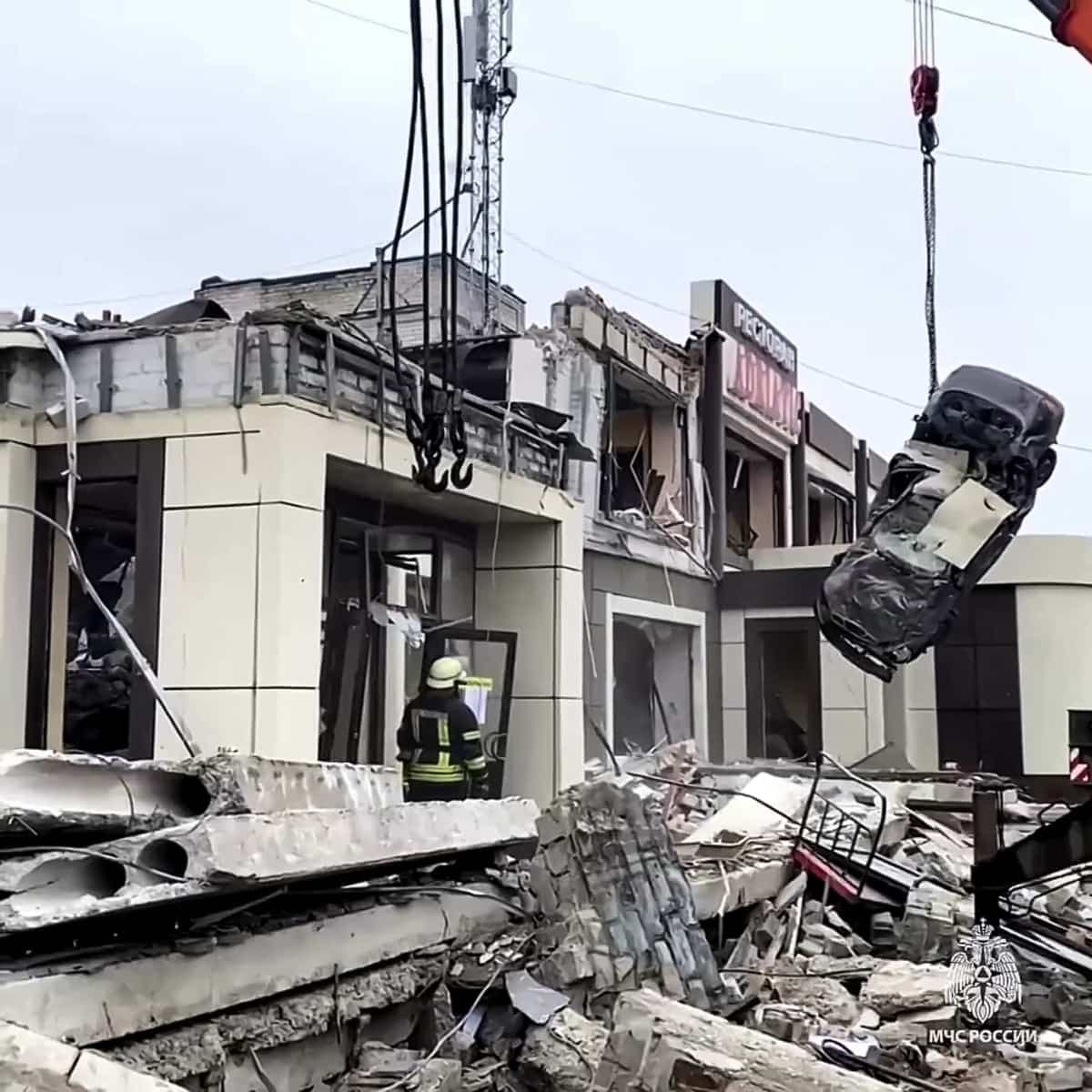 L’agence de presse russe RIA Novosti a publié une vidéo d’un bâtiment détruit, où l’on voit aussi des secouristes sortir des décombres une voiture entièrement écrasée.
