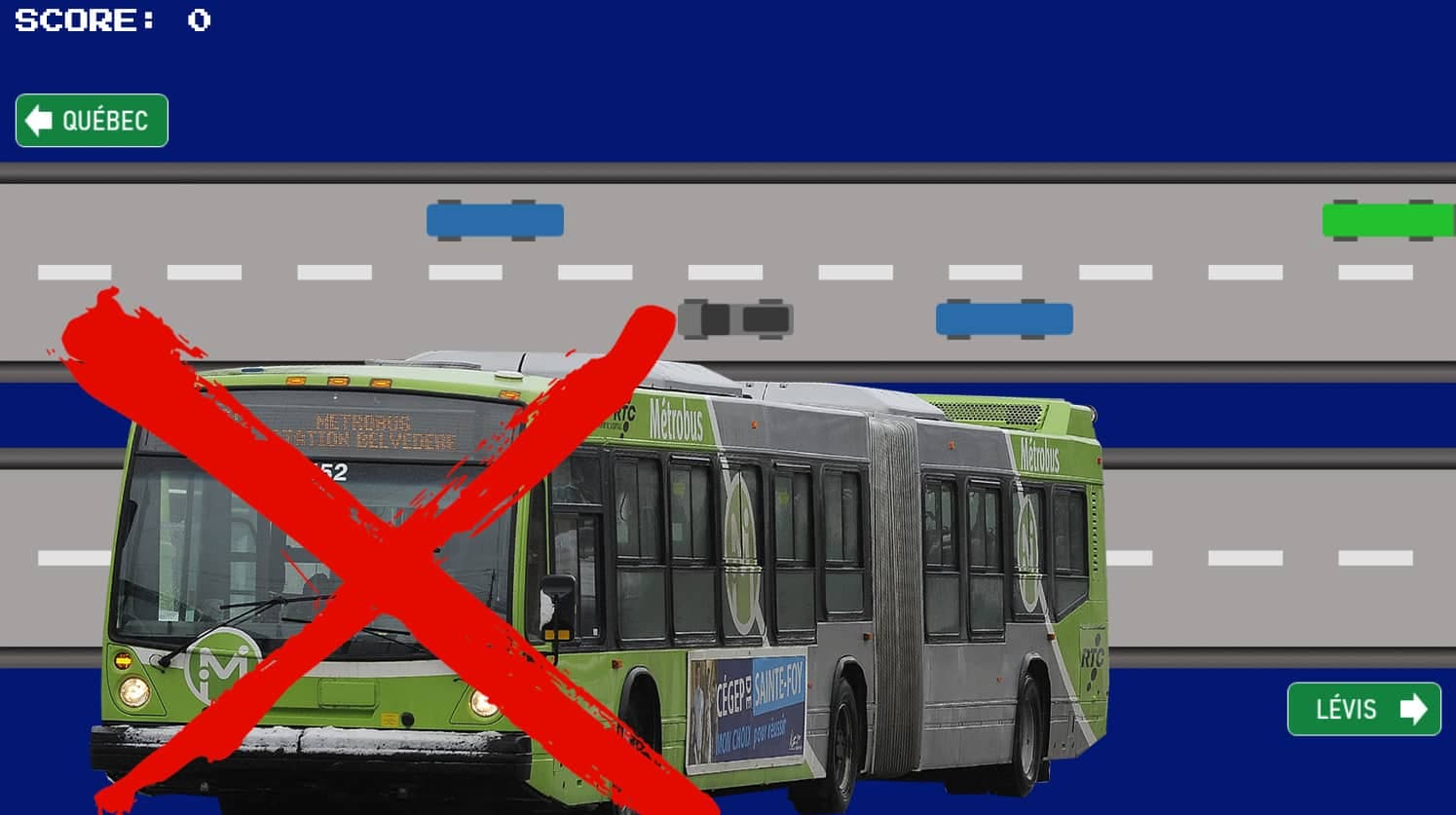 On obtient alors des points selon les véhicules que l’on cible. Un «autobus de 40 pieds» vous donnera 10 points, un «autobus 62 pieds» en vaut 30 et c’est le jackpot si vous parvenez à trouver le rare «autobus 62 pieds contenant des électeurs de Québec solidaire», qui vous graciera de 40 points.