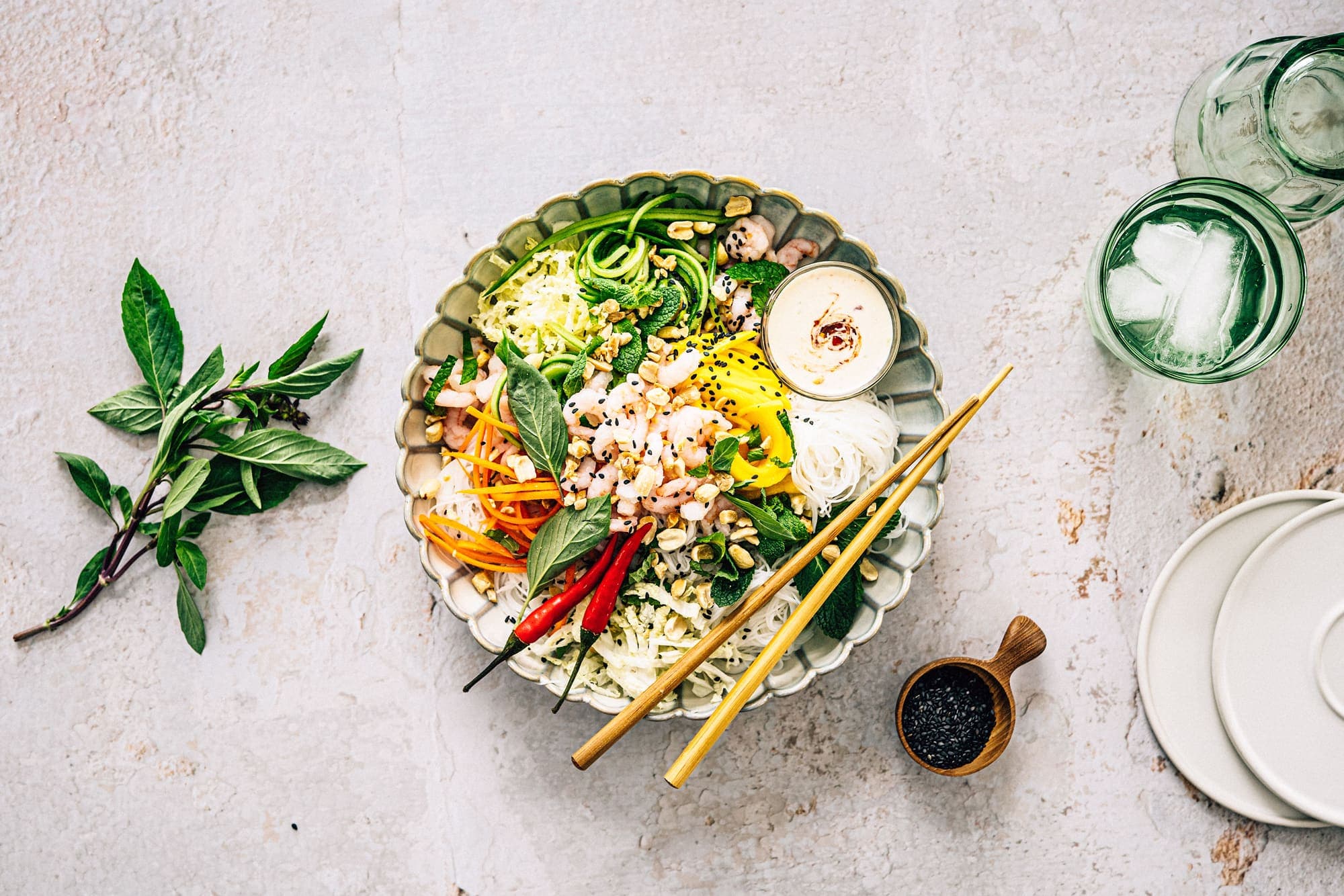 Pour aller vite, pour se faciliter la vie ou éliminer l’étape désagréable où il faut rouler plein d’ingrédients dans une toute petite feuille de riz, on a décidé de croire qu’un rouleau de printemps, c’est bien meilleur déconstruit ! Puisque les nouilles de riz vont absorber la sauce, il est préférable d’en préparer un peu plus et d’en ajouter dans un petit bol au service.