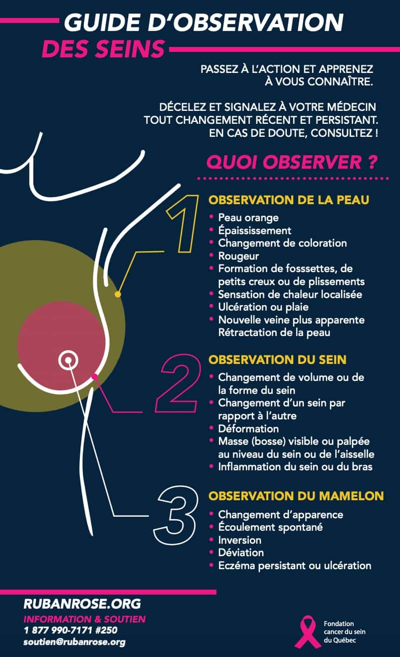 Il est important de s'observer soi-même pour signaler à son médecin tout changement ou anomalie. La Fondation du cancer du sein a d'ailleurs mis en ligne un guide d'observation des seins, de la peau et des mamelons.