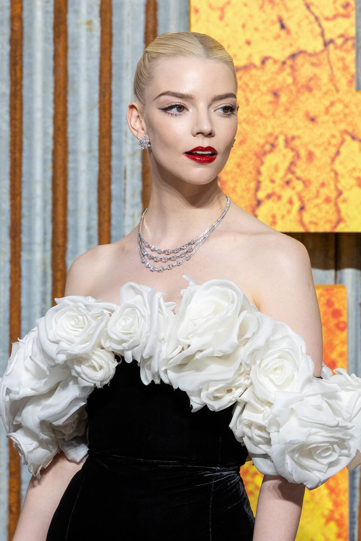 Léger strabisme, bouche rouge sombre, chignon ultra serré et une vertigineuse création Dior - corset et maxi jupon ton champagne entièrement couverte de cristaux - la star de "Furiosa" a offert l'un des moments de grâce du tapis rouge.