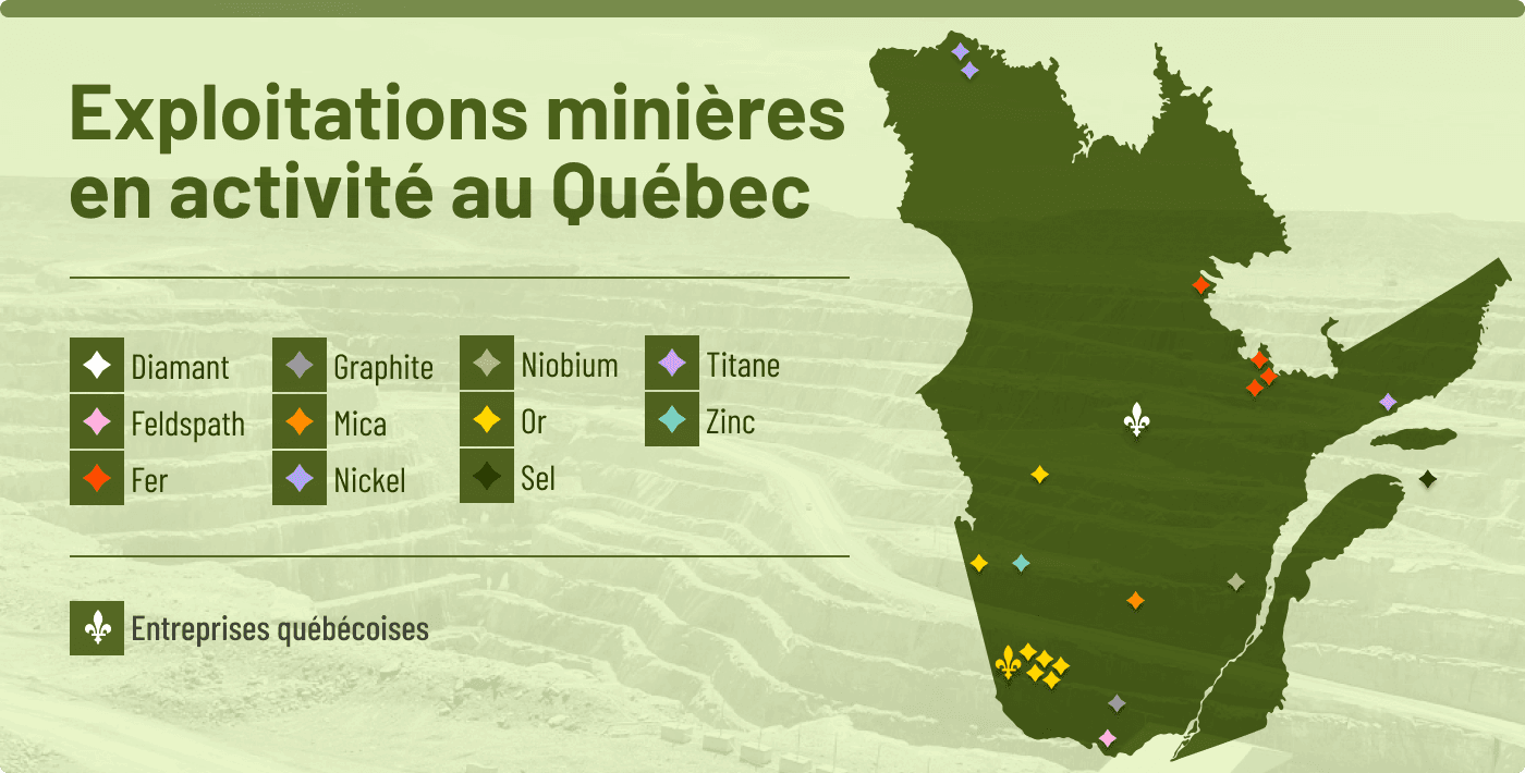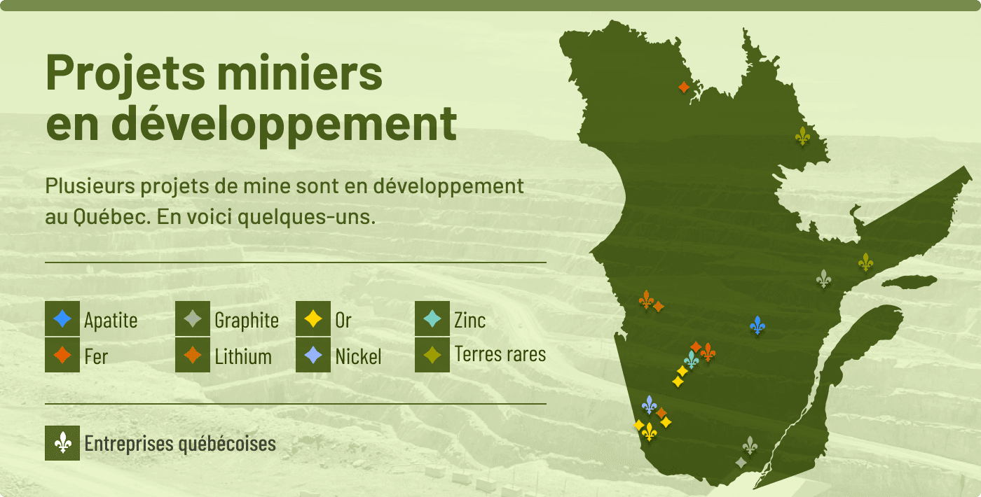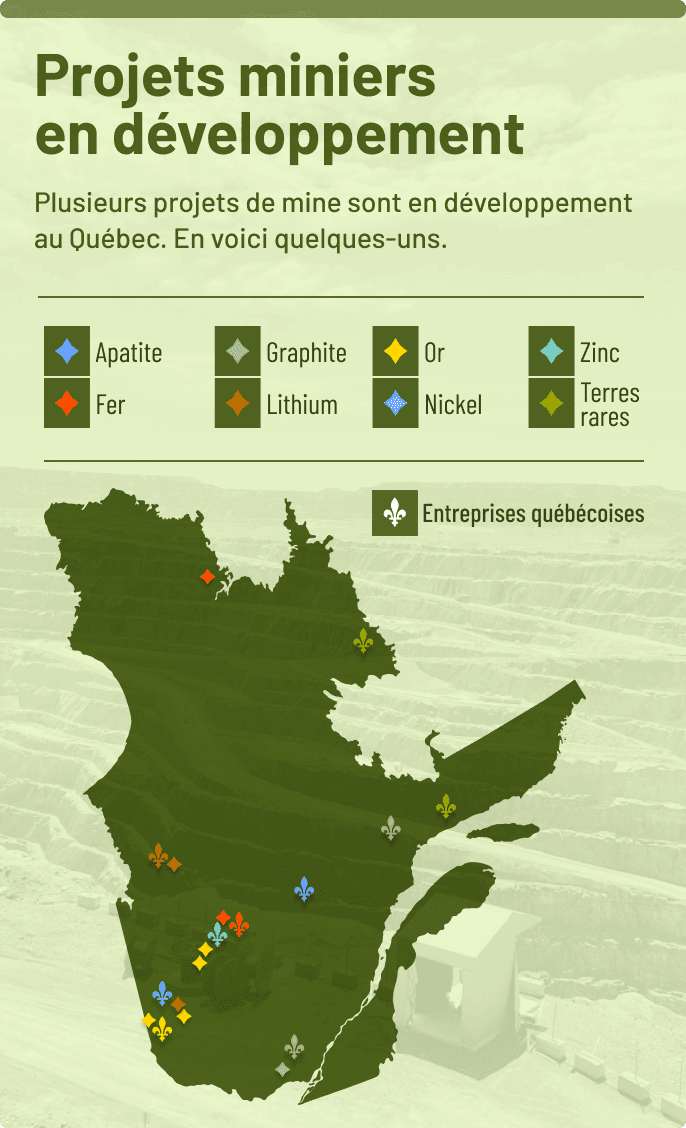 Jusqu’en 2009, des entreprises québé- coises détenaient trois des cinq projets miniers les plus prometteurs sur notre territoire : Canadian Malartic (or), Cana- dian Royalties (nickel) et lac Bloom (fer). Aujourd’hui, ces projets sont devenus des mines qui appartiennent toutes à des entreprises de l’extérieur du Québec.