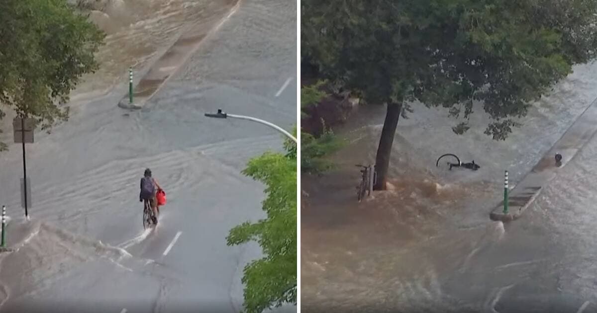 Ce cycliste a tenté de traverser le déluge en vélo et ça s’est plutôt mal passé