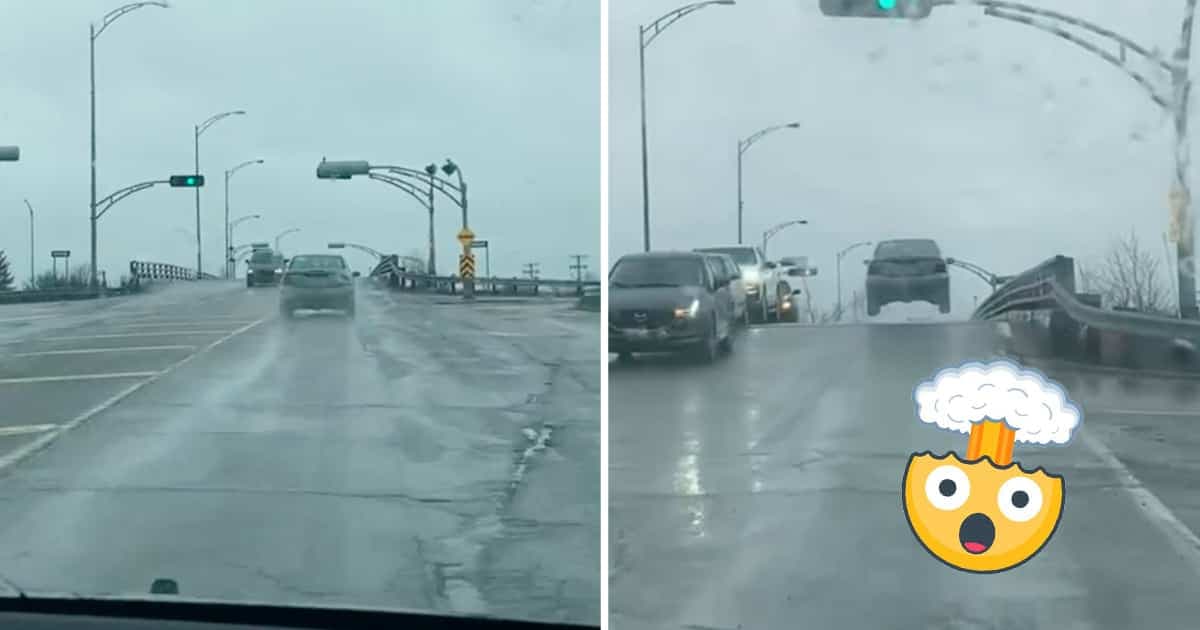 La scène, filmée à travers le pare-brise d’une voiture, montre une auto arriver à un viaduc et littéralement s’envoler lorsqu’elle roule sur une bosse.