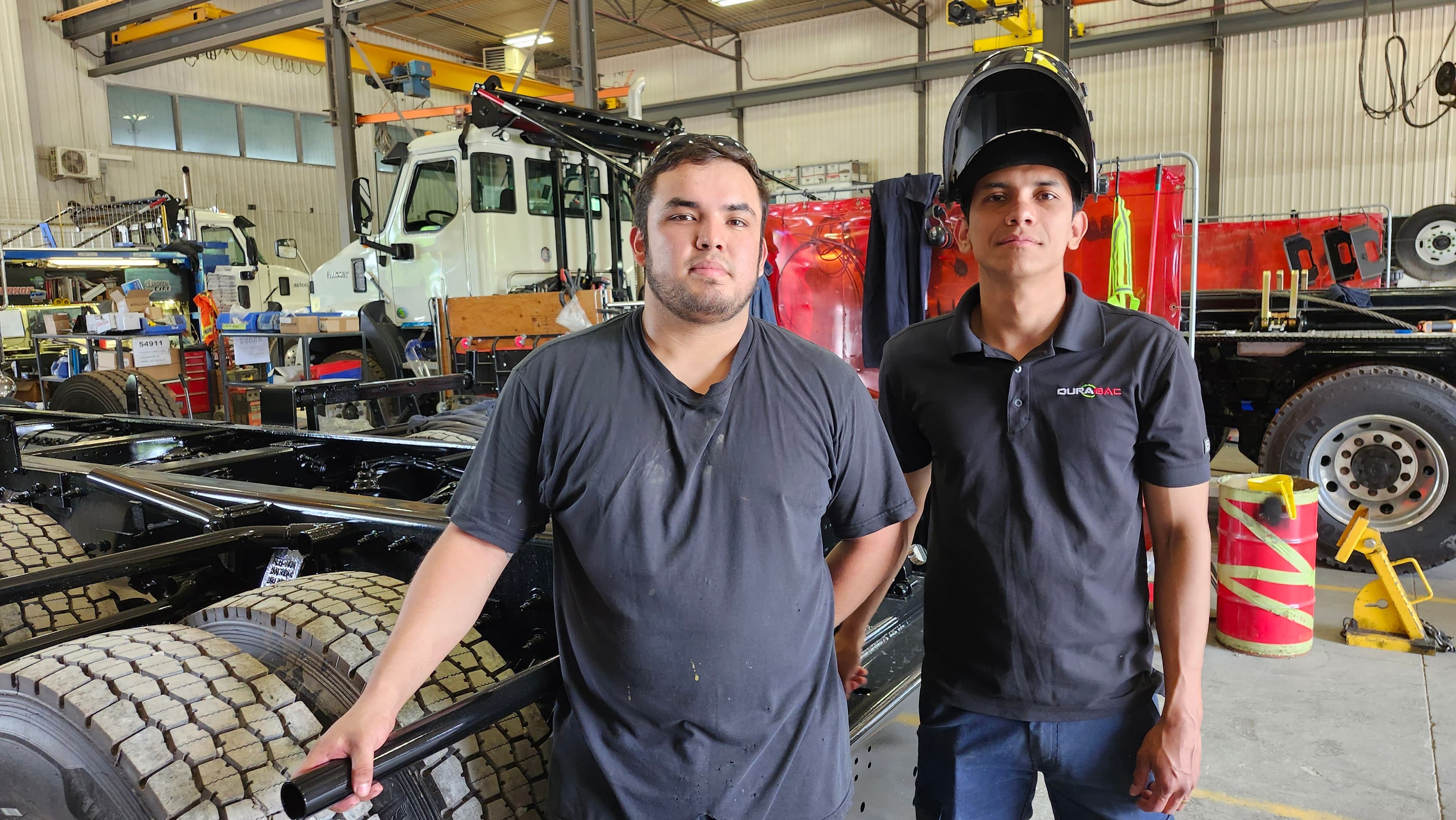 L’homme travaille chez Durabac, une entreprise québécoise de fabrication de contenants de camions de collecte en acier et en plastique, à Granby.
