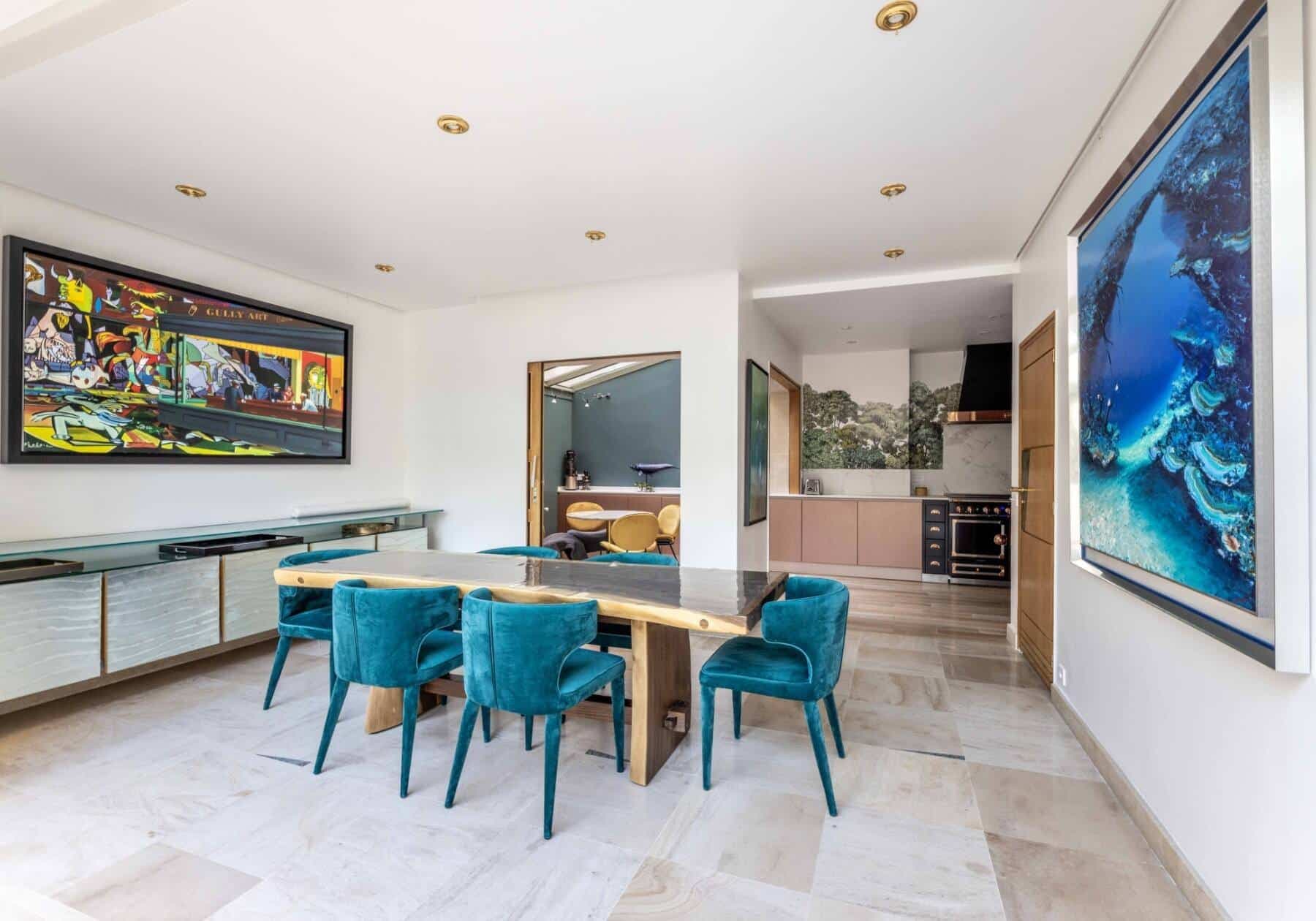 L’hôtel particulier comprend un cinéma maison, cinq suites avec leur propre salle de bain, un double séjour avec cheminée de plain-pied sur terrasse, une bibliothèque avec 6 mètres de hauteur sous plafond, et une terrasse avec vue imprenable sur Paris.