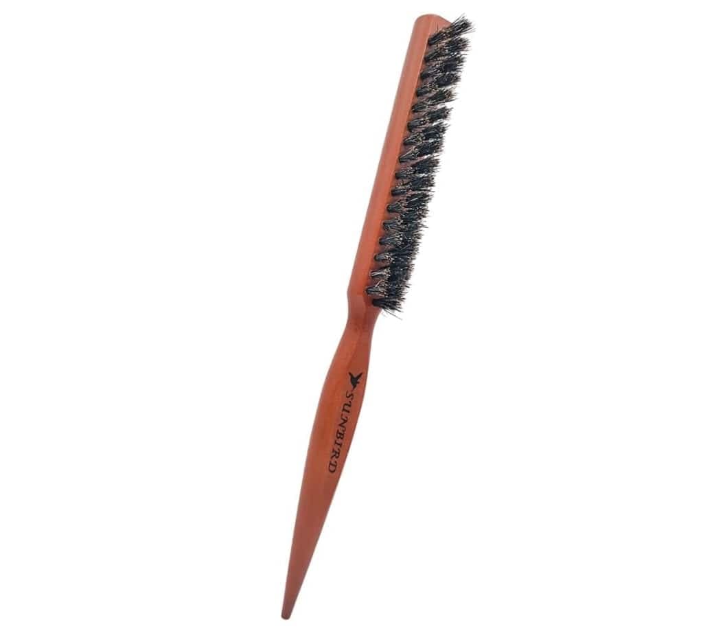 On utilise une brosse à poils multiples pour lisser nos cheveux vers l’arrière, avec un gel au fini naturel.