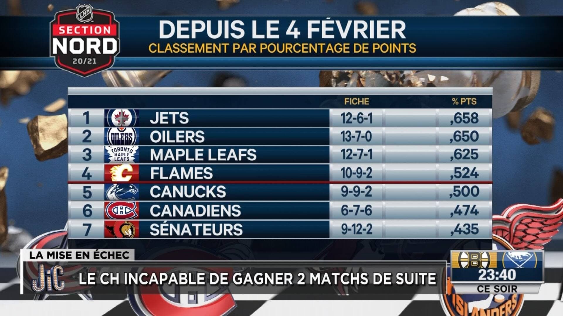 En effet, seuls les Sénateurs d’Ottawa présentent un pire pourcentage de points que le Tricolore depuis cette date dans la section Nord.