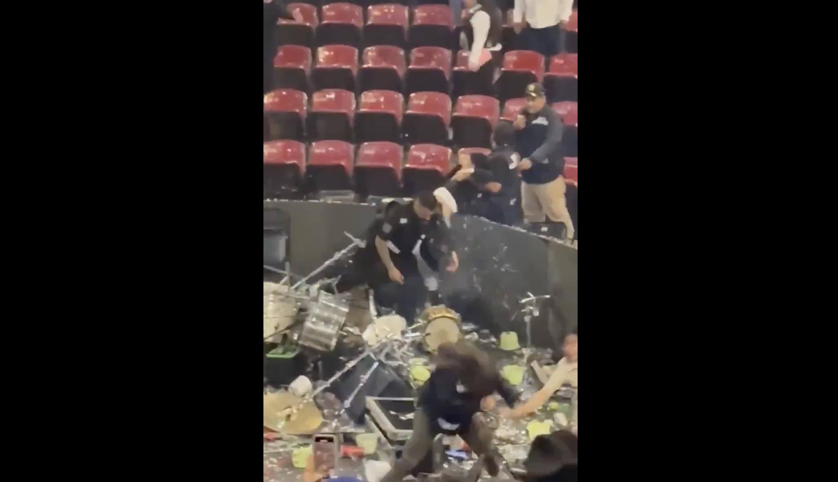 Le public furieux commence alors à lancer des objets en direction de la scène, à la suite de quoi le chanteur et ses musiciens quittent la salle sous les quolibets et les projections en tout genre. Une vingtaine de spectateurs se précipitent alors sur la scène et démolissent instruments de musique, écrans et équipements de son, avant une mêlée avec les vigiles venus les en empêcher.