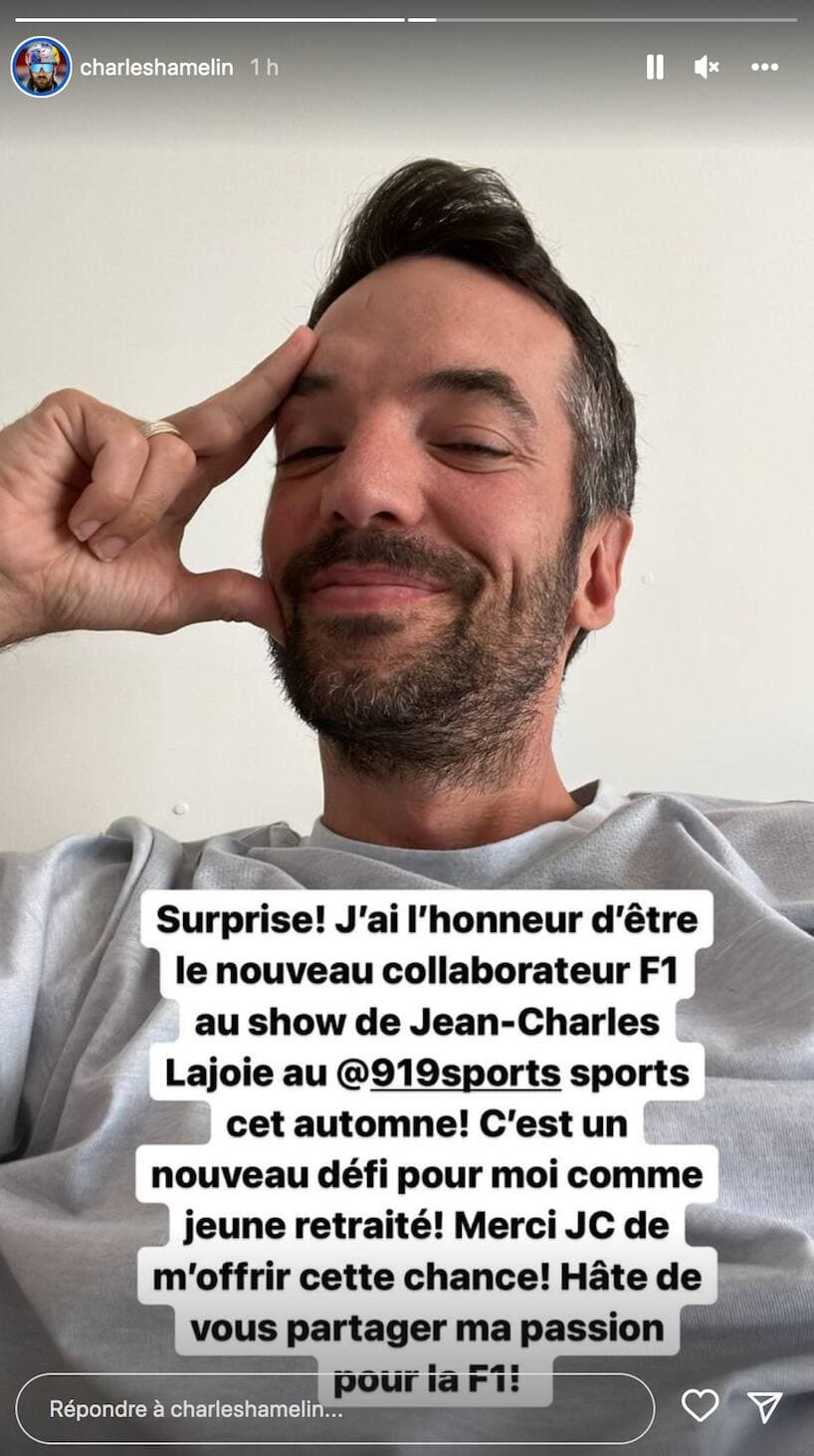 Eh bien mercredi matin, Charles Hamelin a dévoilé son tout nouveau projet en tant que «jeune retraité»: il se joint à l'émission radiophonique de Jean-Charles Lajoie (qui a d'ailleurs été le célébrant lors de son mariage) à titre de collaborateur pour tout ce qui touche à la formule 1.