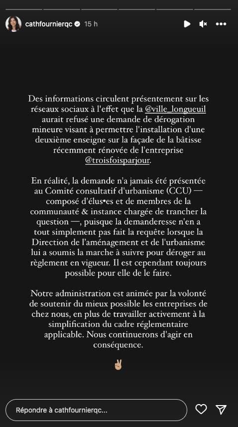 Également en story, elle précise que la demande de dérogation pour l’ajout d’une deuxième enseigne «n’a jamais été présentée» au Comité consultatif d’urbanisme (CCU), composé d’élus et de membres de la communauté.