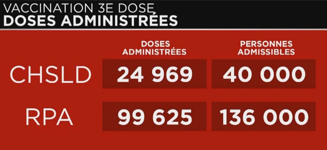 Dans les résidences privées pour aînés (RPA), où l’opération 3e dose n’est pas terminée, 99 625 personnes l’ont reçue sur 136 000 personnes admissibles.