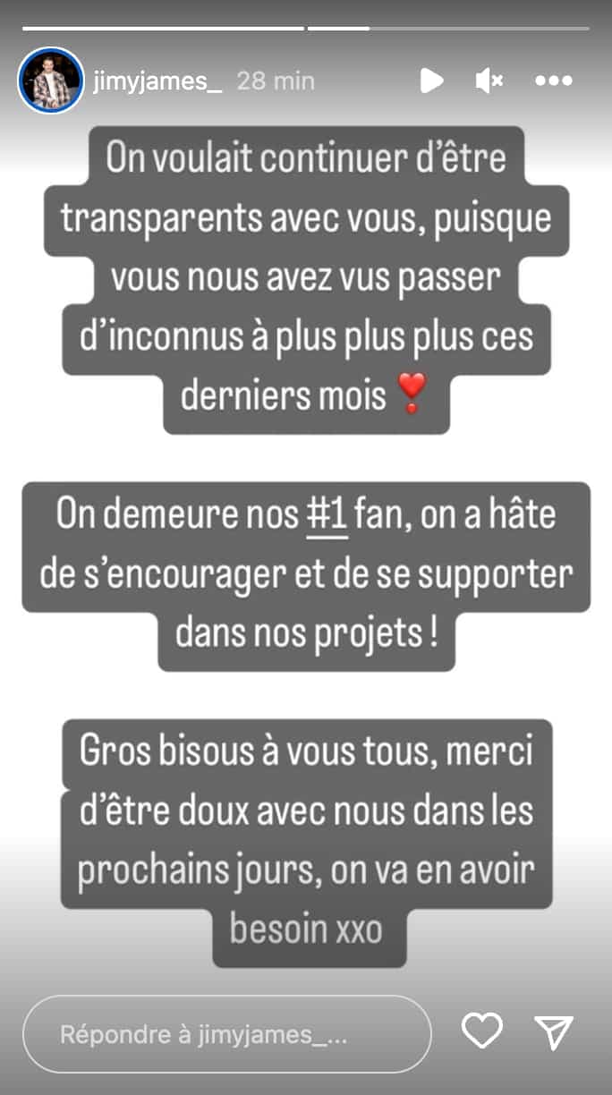 «On voulait continuer d’être transparents avec vous, puisque vous nous avez vus passer d’inconnus à plus plus plus ces derniers mois. On demeure nos #1 fans, on a hâte de s’encourager et de se supporter dans nos projets! Gros bisous à vous tous, merci d’être avec nous dans les prochains jours, on va en avoir besoin».