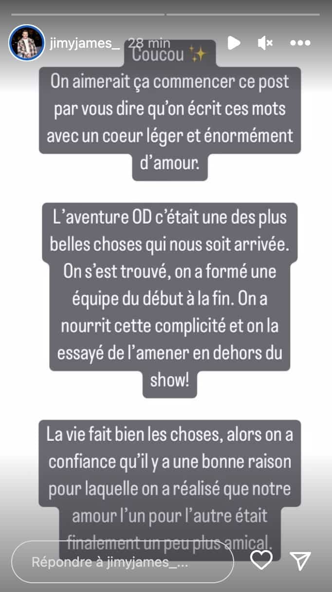 «Coucou. On aimerait ça commencer ce post par vous dire qu’on écrit ces mots avec un cœur léger et énormément d’amour. L’aventure OD c’était une des plus belles choses qui nous soit arrivée. On s’est trouvé, on a formé une équipe du début à la fin. On a nourrit [sic] cette complicité et on a essayé de l’amener en dehors du show!»