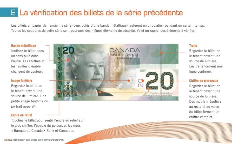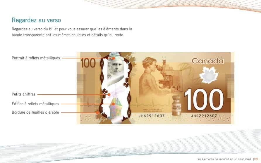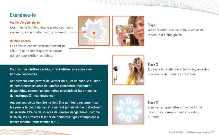 - Touchez le billet pour sentir l’encre en relief sur le grand chiffre, les épaules du grand portrait et les mots «Banque du Canada»