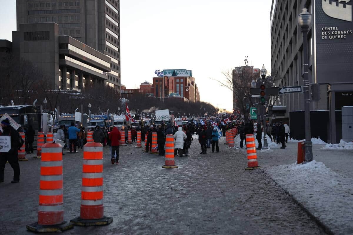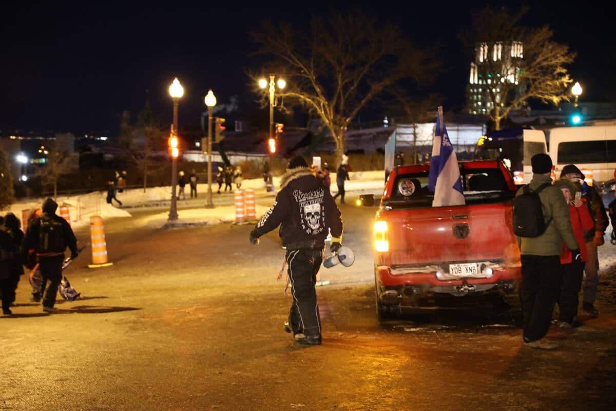 22h15 | Alors que les manifestants sont partis graduellement dans une ambiance festive en soirée, le SPVQ a annoncé qu'il tolérerait les poids lourds stationnés sur le boulevard René-Lévesque pour la nuit. Cependant, aucune infraction ne sera tolérée. Le concert de klaxons continuait de retentir aux abords de l'Assemblée nationale. Un homme de 31 ans a été arrêté pour entrave et sa camionnette a été remorquée. Au total, les agents ont remis 11 constats en vertu de la réglementation municipale sur la paix et le bon ordre ainsi que 10 constats en vertu du Code de la sécurité routière.