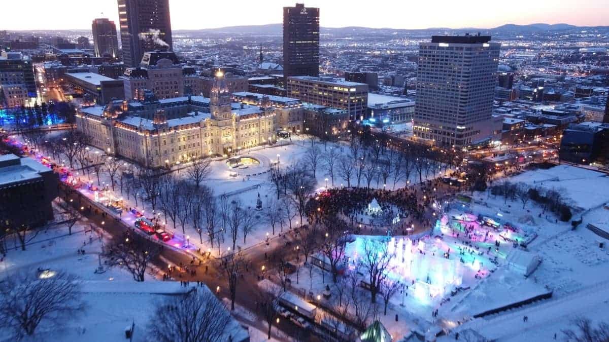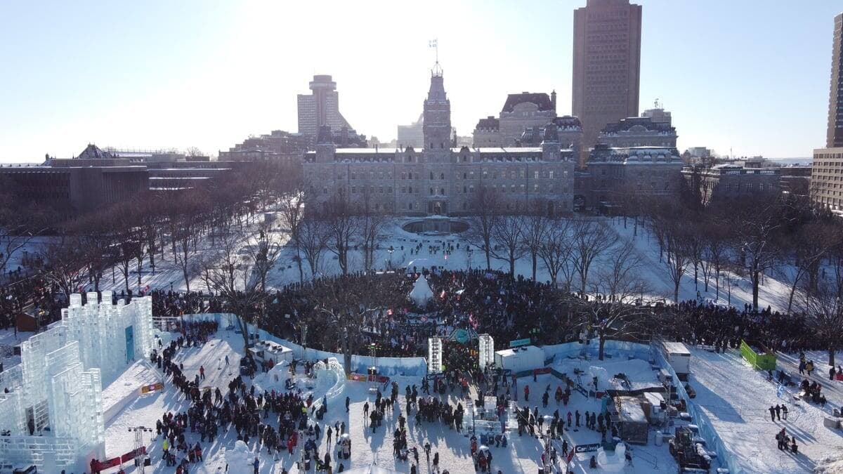 11h45 | La fontaine de Tourny est scindée en deux. D’une part, les manifestants écoutent solennellement l’hymne national canadien, avant d’enchaîner sur des airs de Guns N Roses. De l’autre, les visiteurs du Carnaval font la file pour découvrir le palais de Bonhomme avec une trame de fond de musique québécoise, protégés par des agents de sécurité.