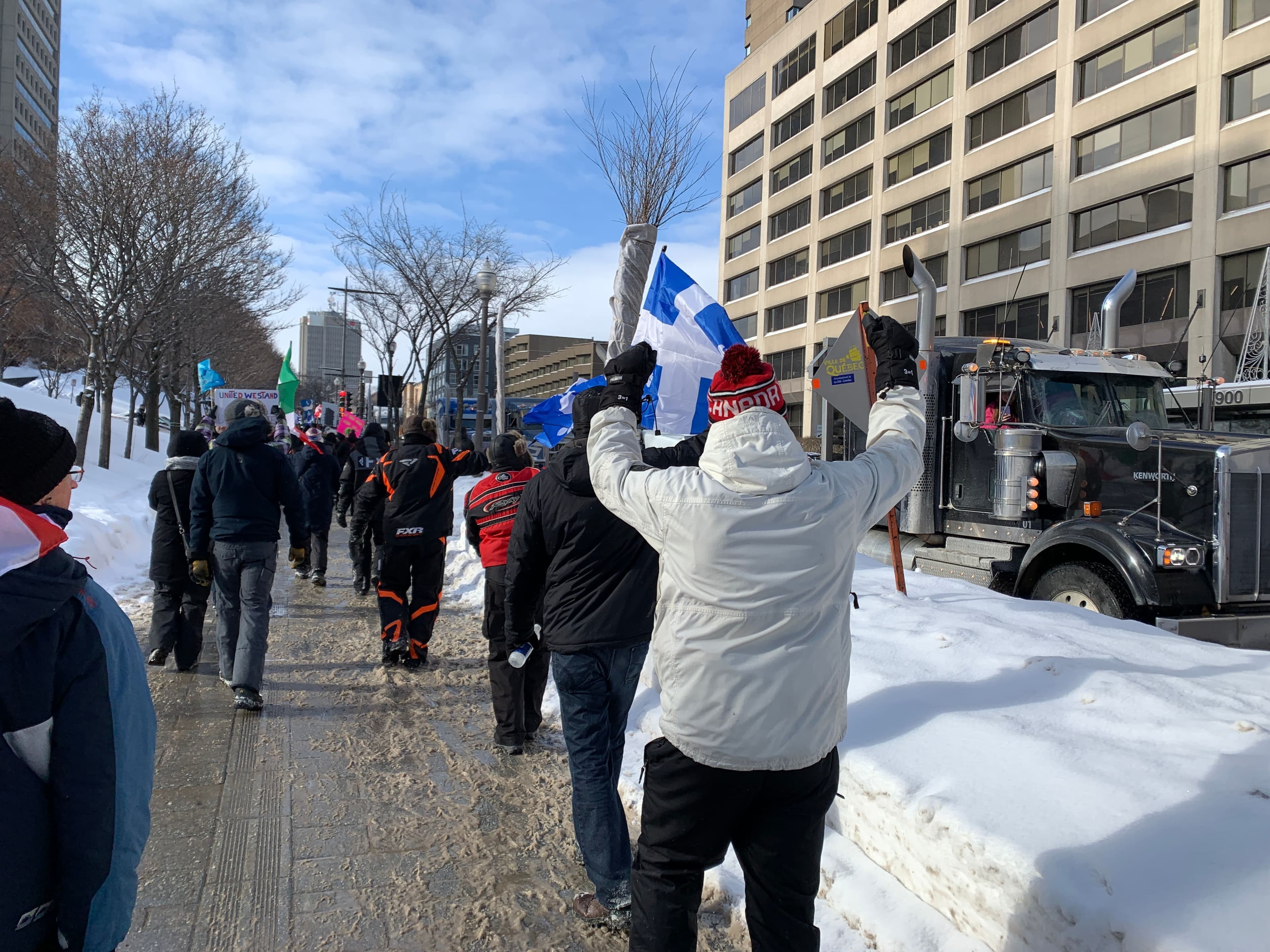 Les camionneurs qui étaient toujours sur le boulevard René-Lévesque viennent tous de quitter sous les acclamations des manifestants restants. Point de presse du maire @brunomarchand à 18h. Celui du @SPVQ_police suivra.@tvanouvelles pic.twitter.com/MOaEqkBD46
